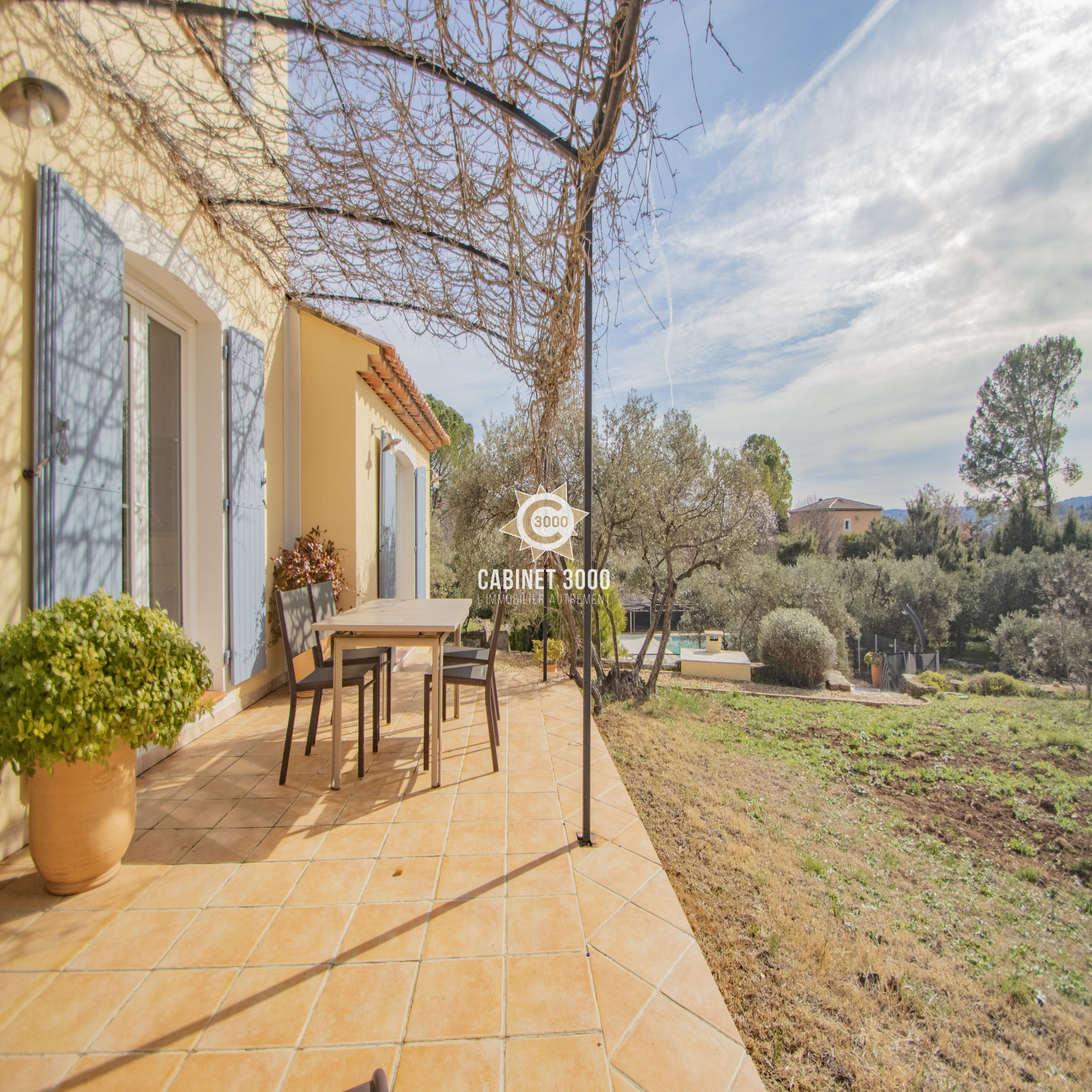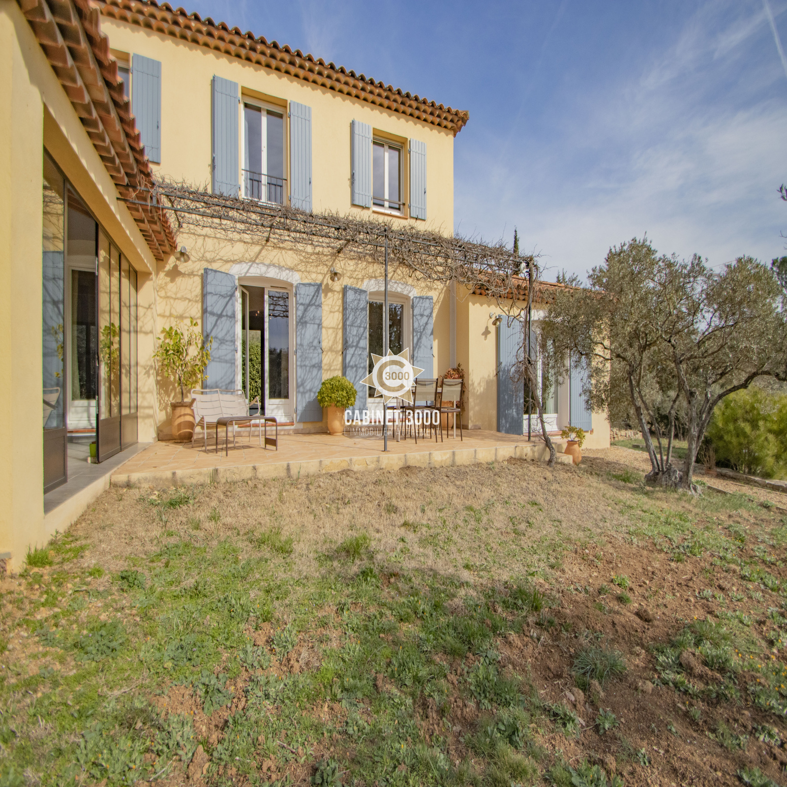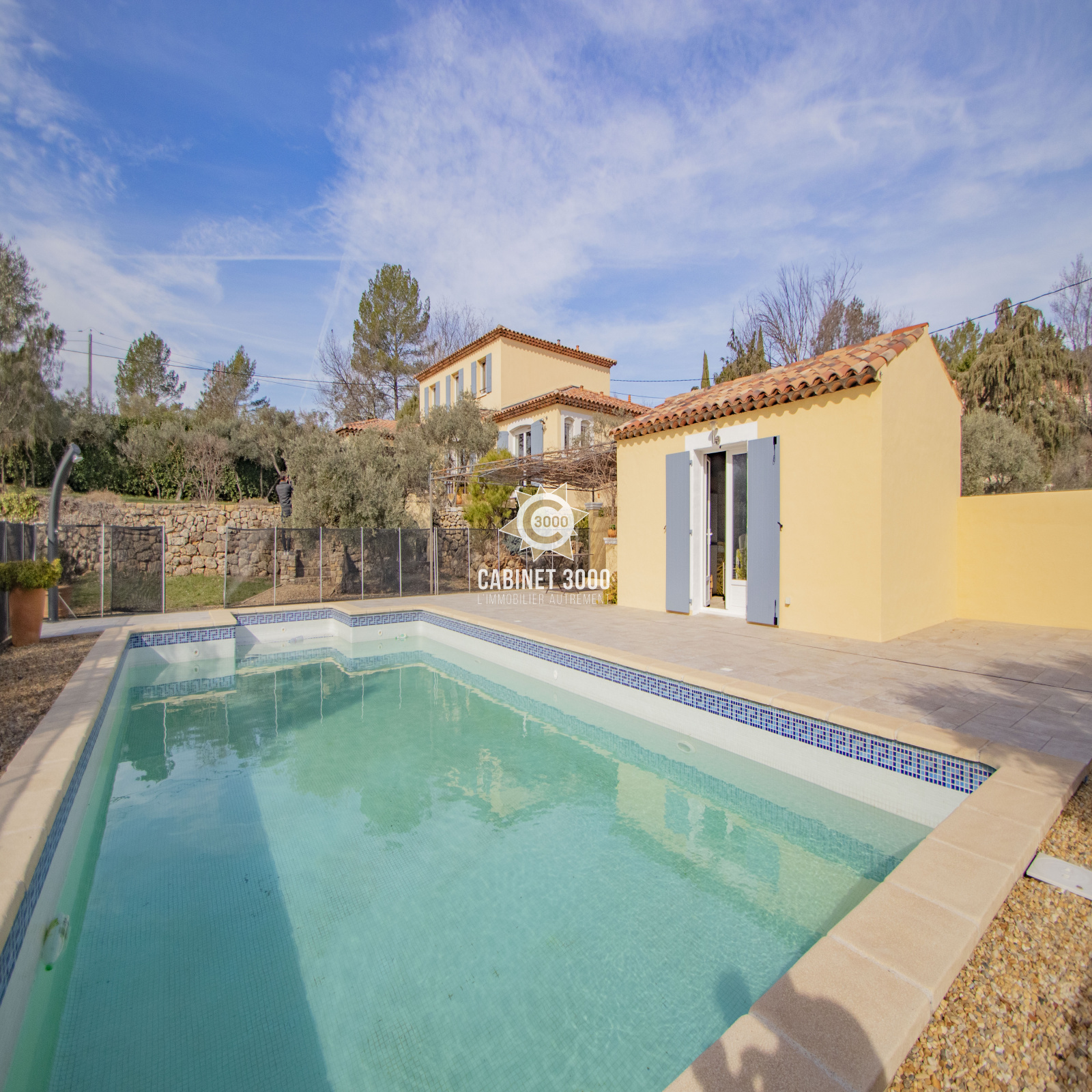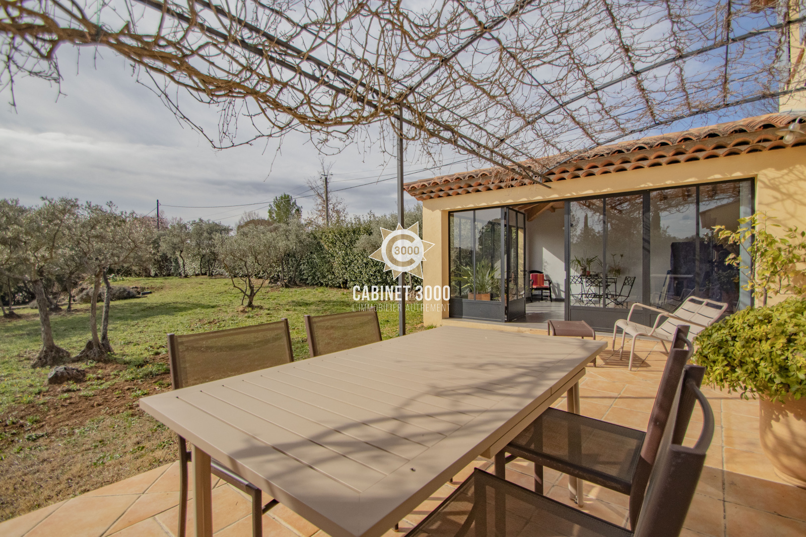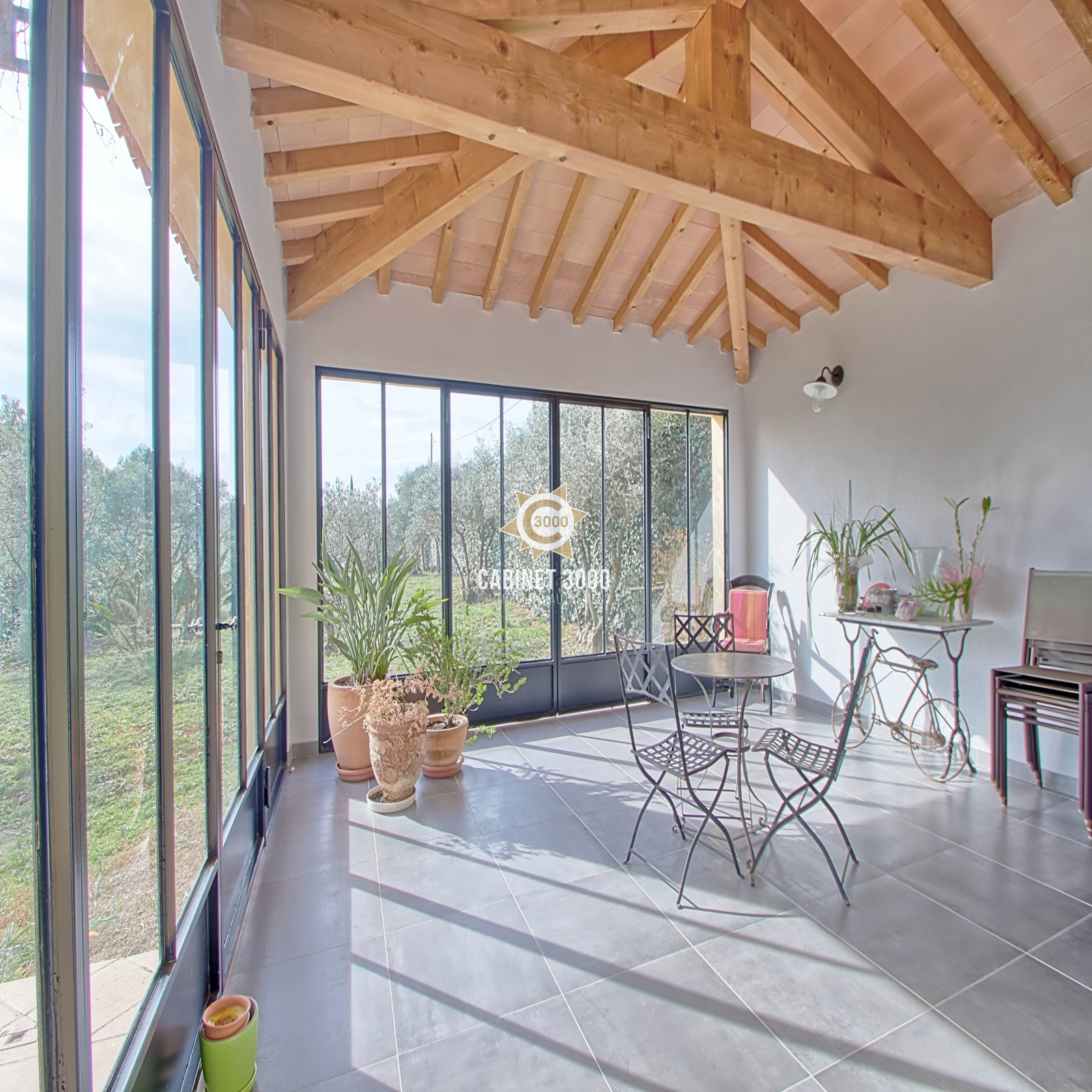 A Carcès, Quartier Les Olivérons, lumineuse maison de type T6 de 192 m², aux prestations et équipements contemporains, comprenant : cuisine ouverte sur salle à manger/salon de 48 m² avec poêle à bois, 4 chambres dont une suite parentale de plain pied avec salle d'eau, WC et dressing, une autre avec salle d'eau, bureau, véranda, terrasse, salle de bain et 2 WC sur une parcelle arborée d'oliviers centenaires de 2 982 m² avec piscine, pool house, garage à moto et parkings.