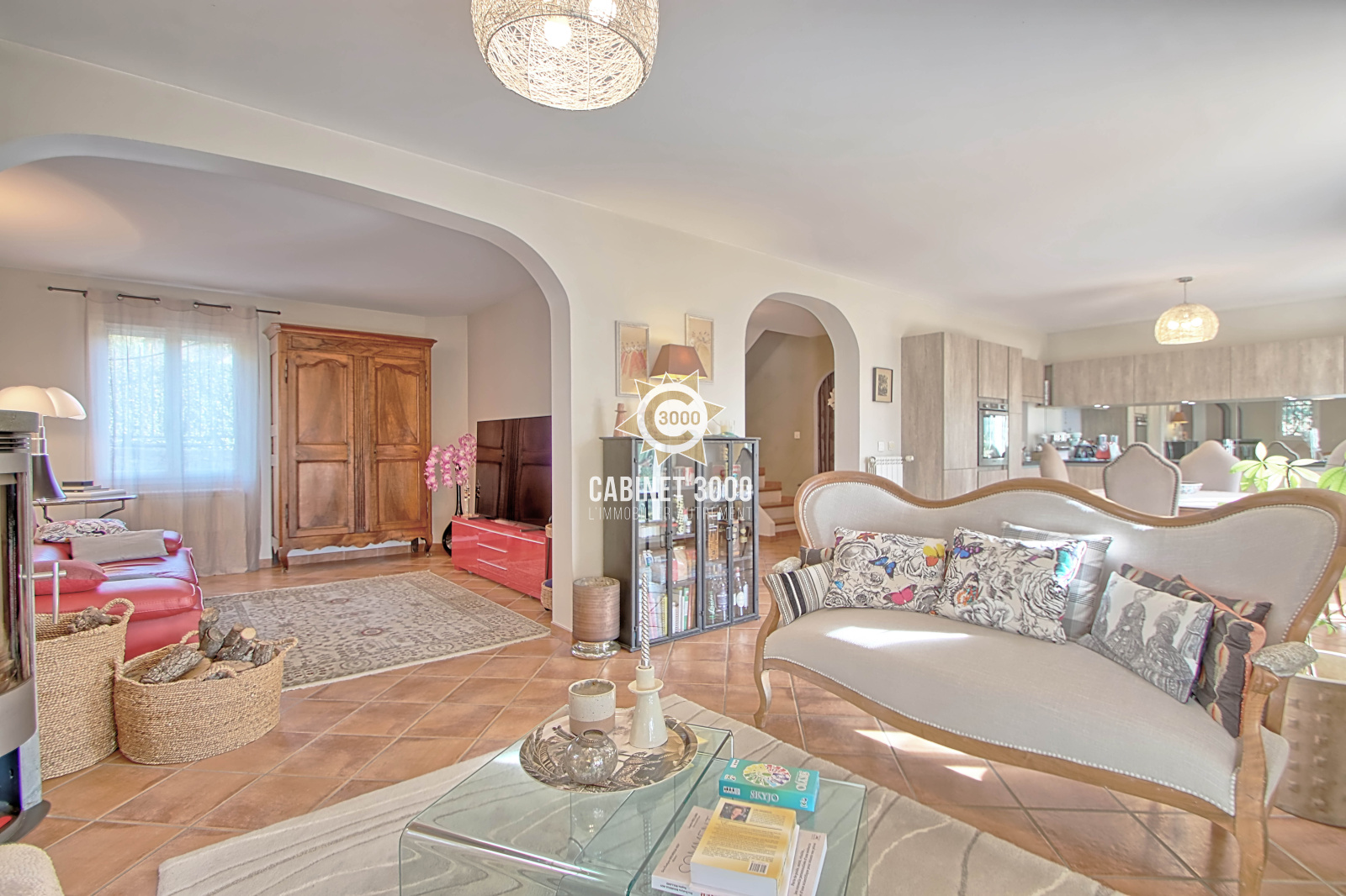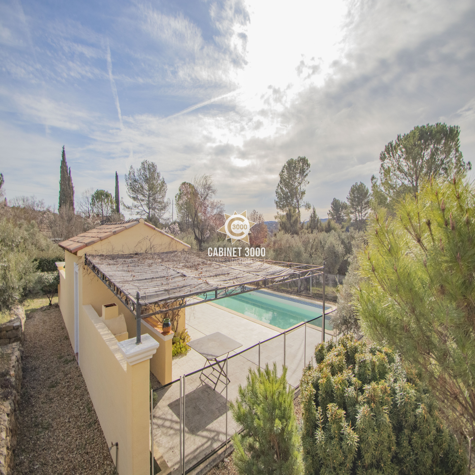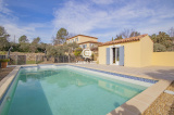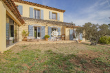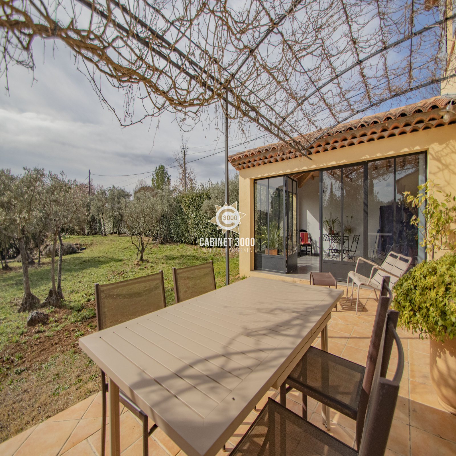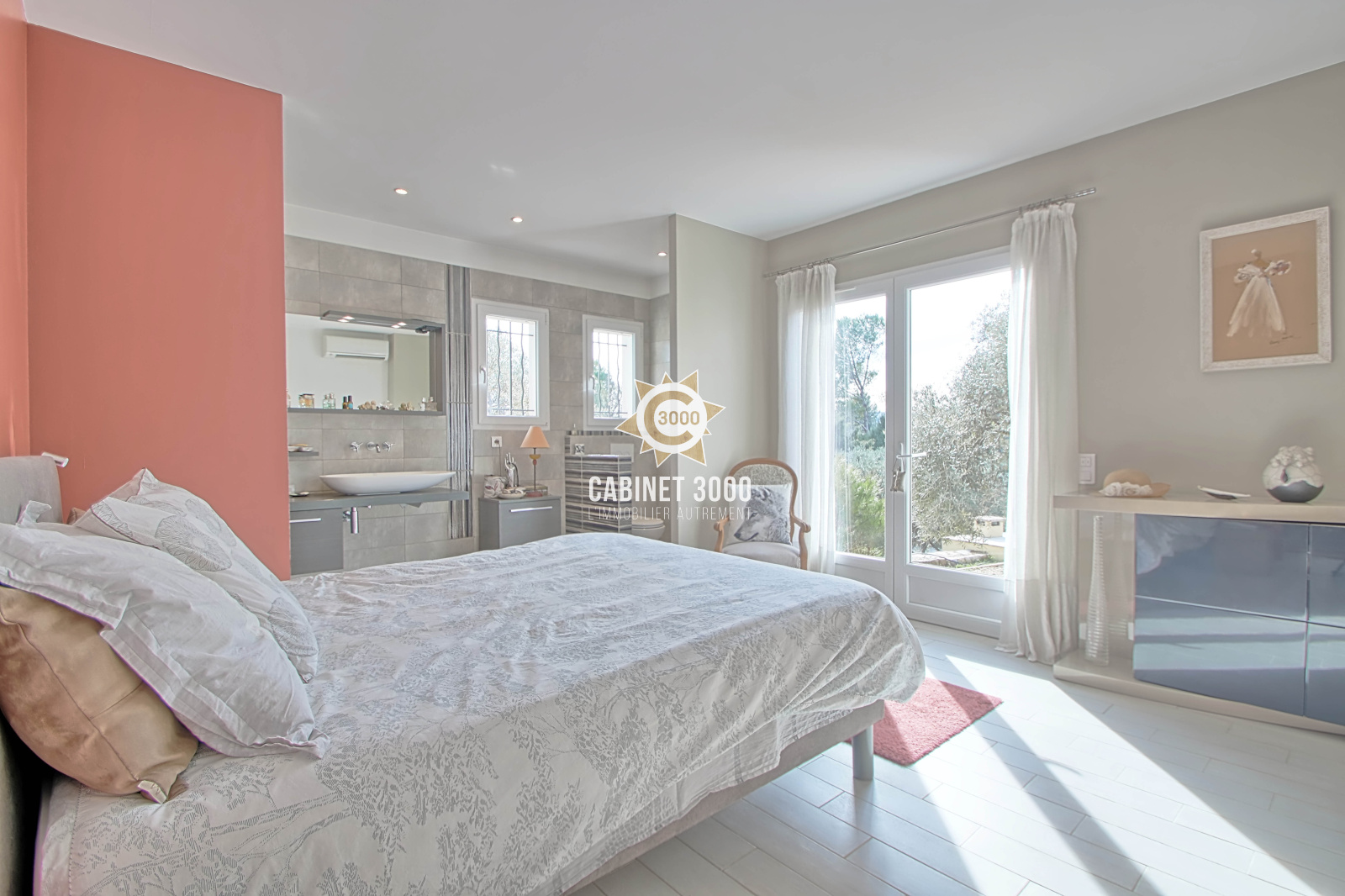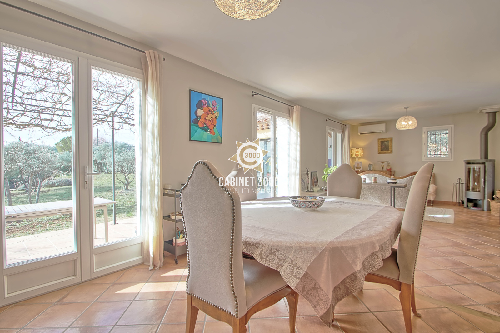 A Carcès, Quartier Les Olivérons, lumineuse maison de type T6 de 192 m², aux prestations et équipements contemporains, comprenant : cuisine ouverte sur salle à manger/salon de 48 m² avec poêle à bois, 4 chambres dont une suite parentale de plain pied avec salle d'eau, WC et dressing, une autre avec salle d'eau, bureau, véranda, terrasse, salle de bain et 2 WC sur une parcelle arborée d'oliviers centenaires de 2 982 m² avec piscine, pool house, garage à moto et parkings.