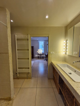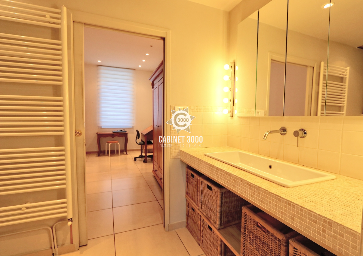 A Toulon, Le Mourillon, dans petite copropriété 1900, appartement de type T5 de 92 m², entièrement rénové, comprenant : cuisine ouverte avec salle à manger donnant sur terrasse de 27 m² sans vis-à-vis, salon, séjour, 2 chambres, bureau, 2 salles d'eau dont une avec WC, WC avec lave-main et 2 caves à proximité des écoles et des commerces.