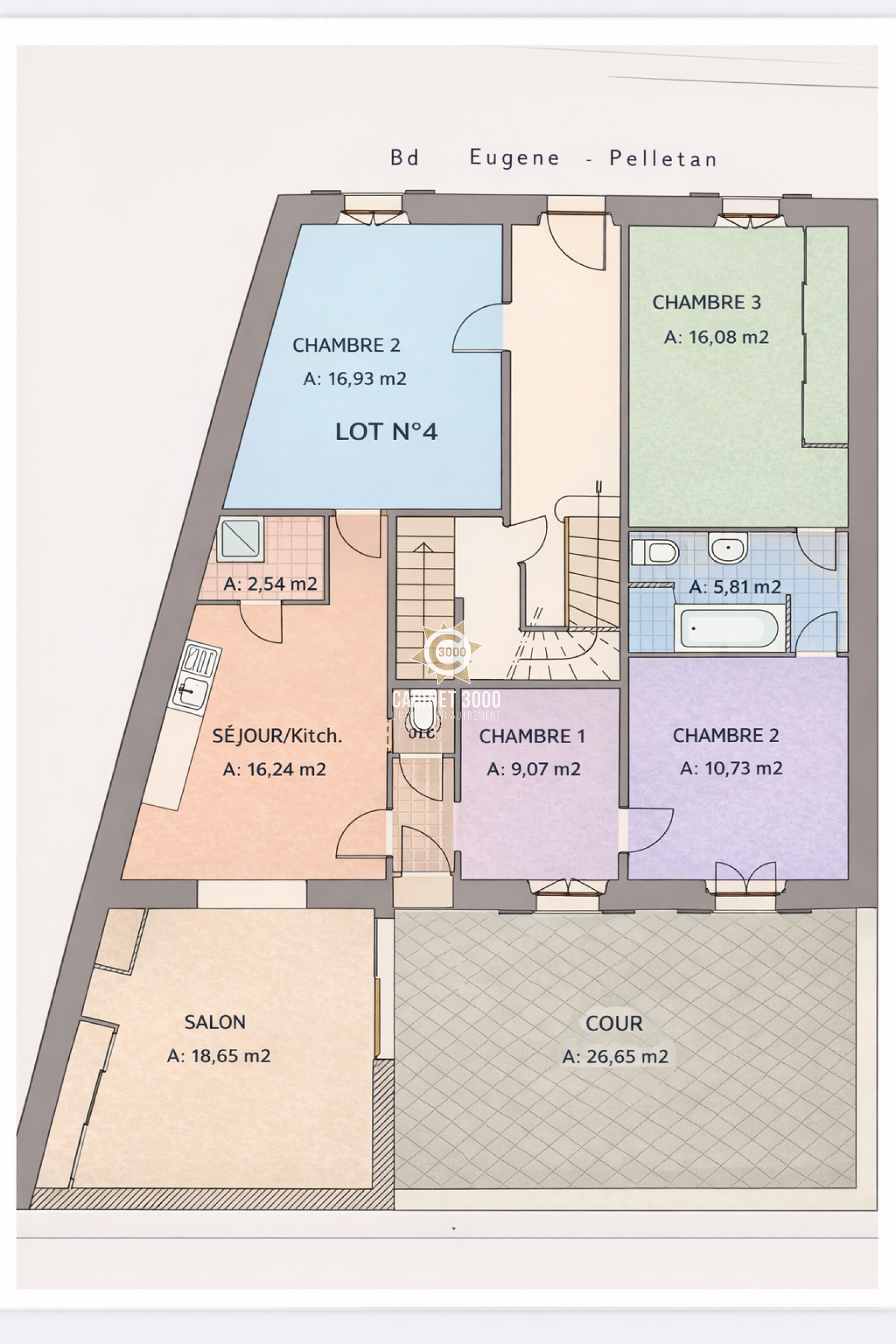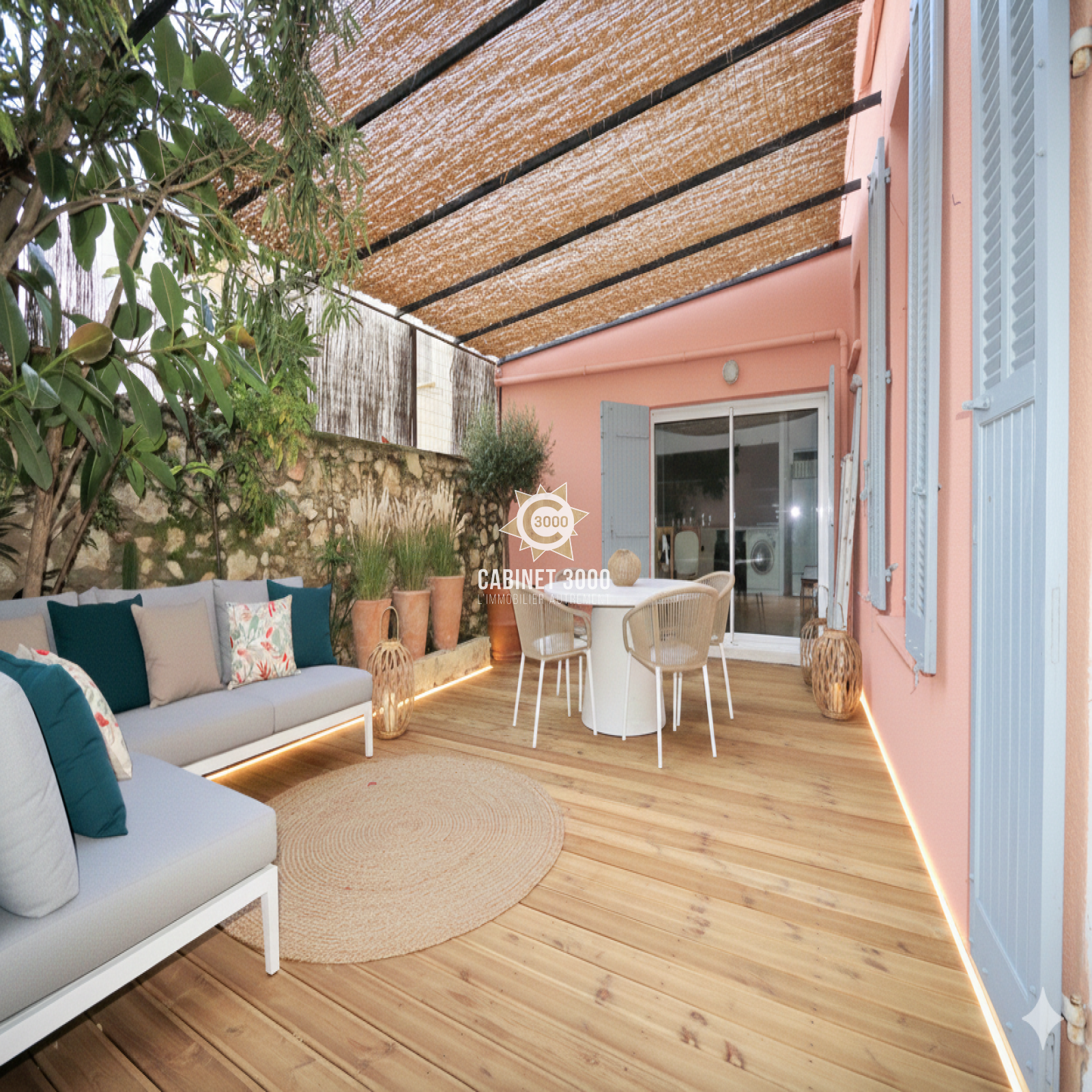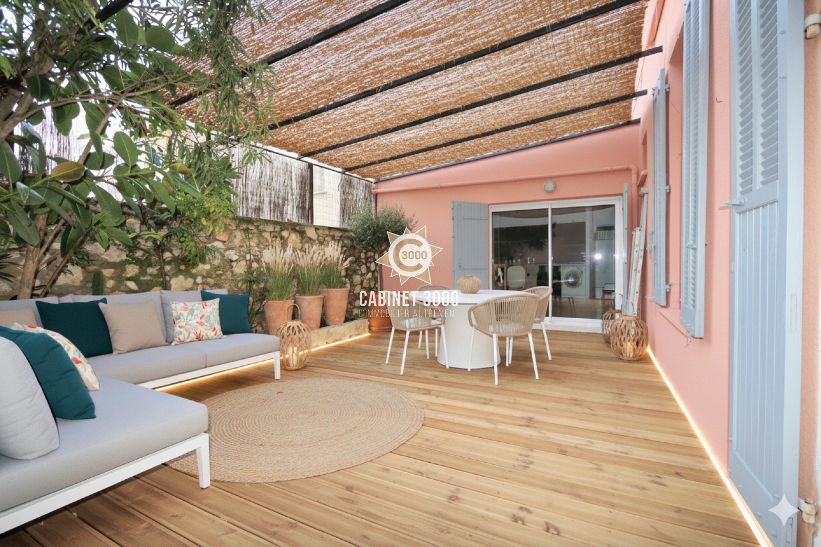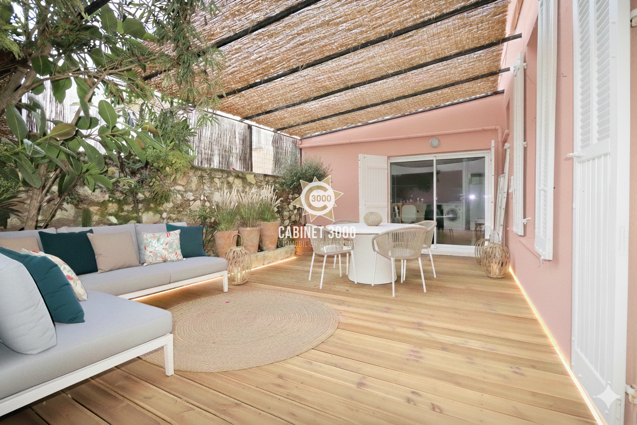 A Toulon, Le Mourillon, dans petite copropriété 1900, appartement de type T5 de 92 m², entièrement rénové, comprenant : cuisine ouverte avec salle à manger donnant sur terrasse de 27 m² sans vis-à-vis, salon, séjour, 2 chambres, bureau, 2 salles d'eau dont une avec WC, WC avec lave-main et 2 caves à proximité des écoles et des commerces.