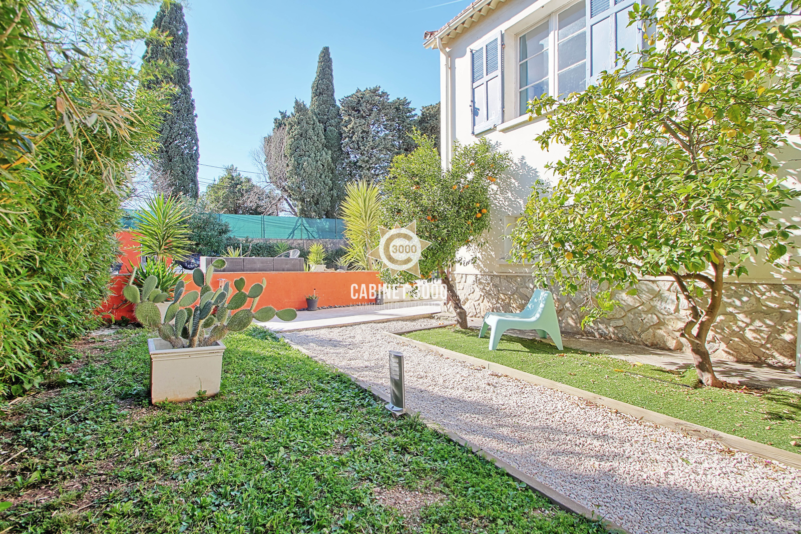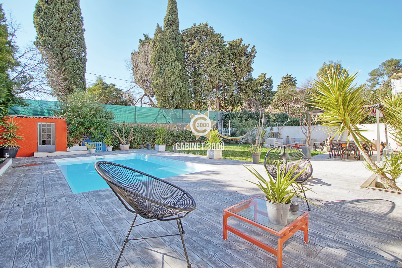 EXCLUSIVITE - A Toulon, La Serinette, au calme, belle maison de type T7 de 175 m² comprenant : cuisine ouverte sur salon, séjour donnant sur jardin, 6 chambres dont studio indépendant de plain pied, espace bureau, salle de bain, 2 salles d'eau, 2 WC, buanderie sur un terrain plat et arboré de 694 m² avec piscine chauffée de 4x5.