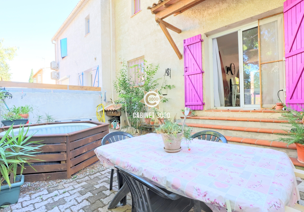 EXCLUSIVITE - A Toulon, Sainte Musse, lumineuse maison de type T4 de 77 m² traversante Est-Ouest, comprenant : cuisine donnant sur salle à manger et terrasse, séjour ouvrant sur une deuxième terrasse, 3 chambres, salle d'eau et 2 WC sur un terrain de 170 m² avec jacuzzi, garage et parking.