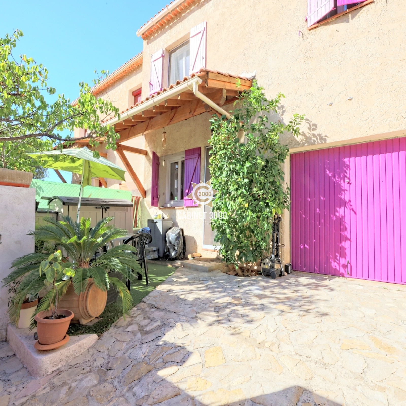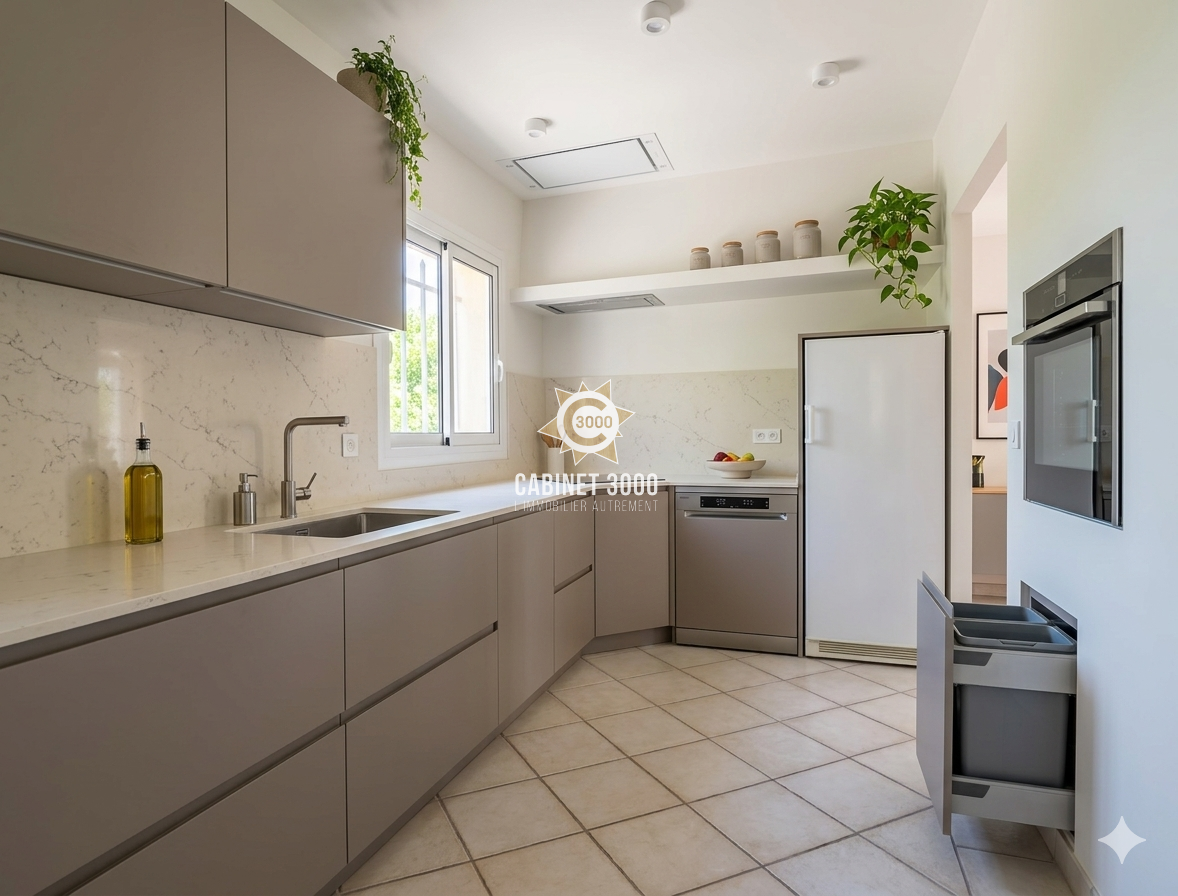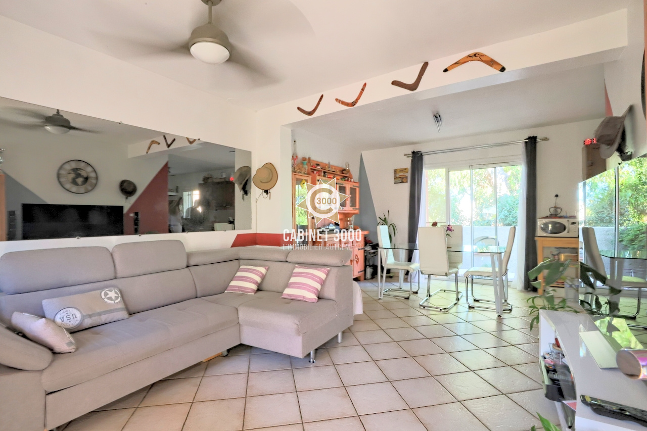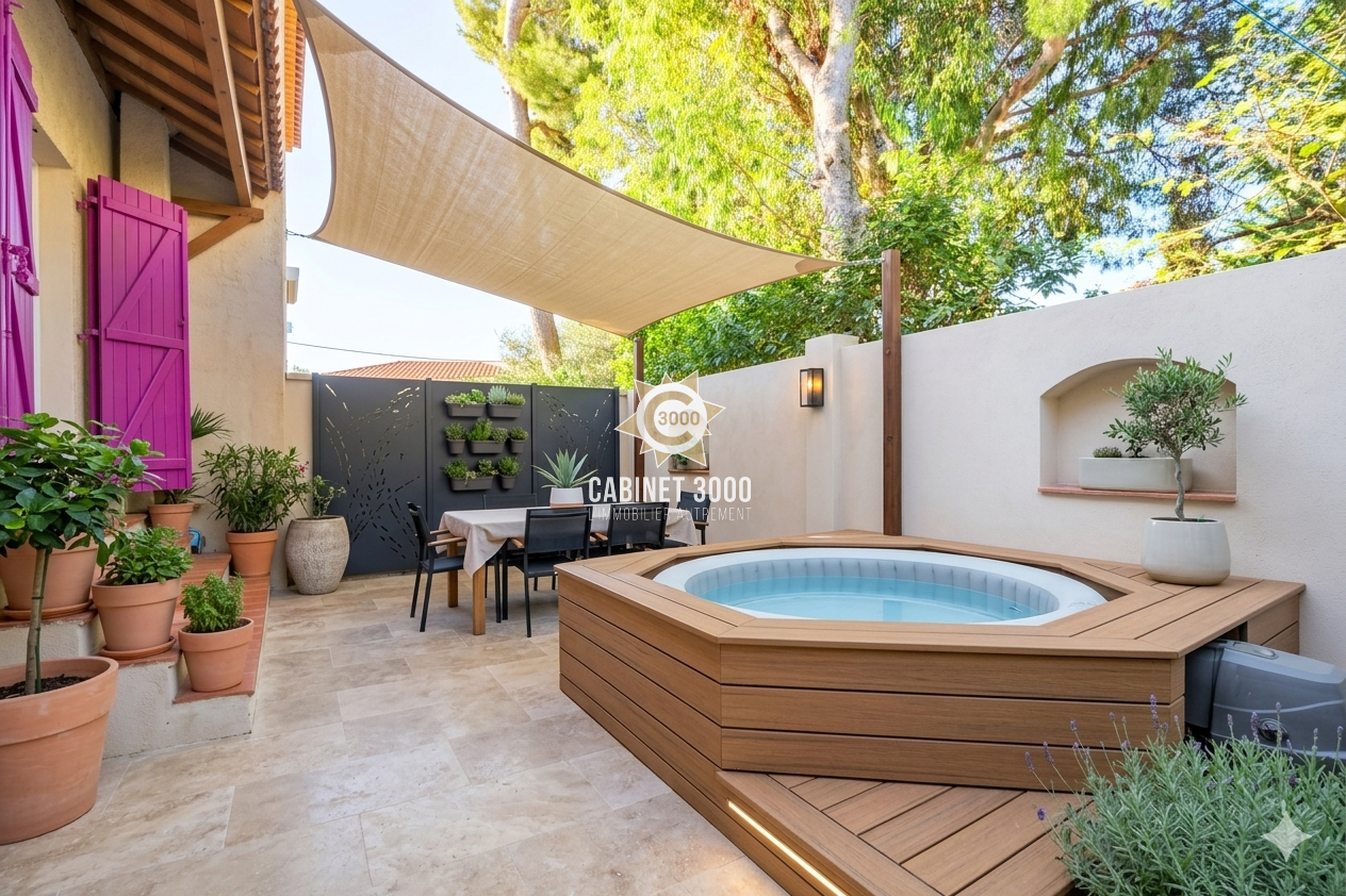 EXCLUSIVITE - A Toulon, Sainte Musse, lumineuse maison de type T4 de 77 m² traversante Est-Ouest, comprenant : cuisine donnant sur salle à manger et terrasse, séjour ouvrant sur une deuxième terrasse, 3 chambres, salle d'eau et 2 WC sur un terrain de 170 m² avec jacuzzi, garage et parking.