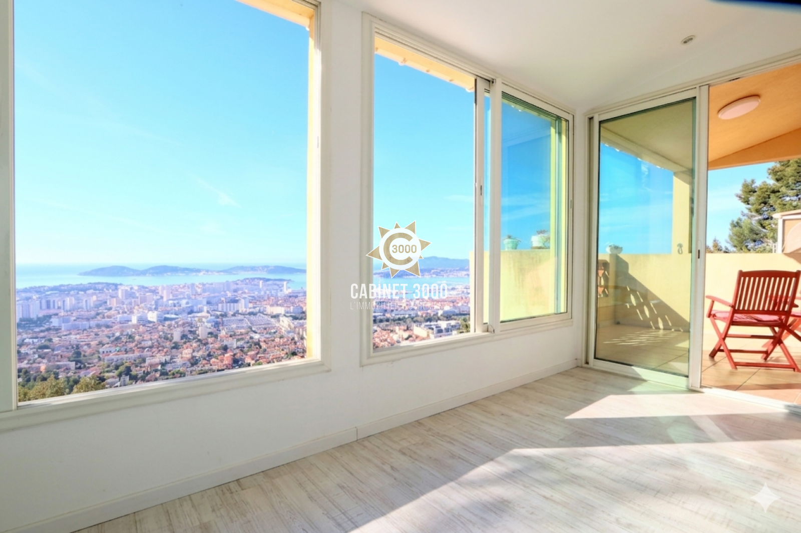A Toulon, sur les hauteurs du Faron, nichée dans un écrin de verdure au calme, lumineuse maison de type T7 de 165 m² avec vue panoramique sur mer et rade comprenant au 1er niveau : cuisine ouverte avec coin repas, salon donnant sur véranda vue mer, salon de télévision, 1 chambre avec rangement, buanderie, cellier et WC ; au 2ème niveau : 4 chambres, salle de bain avec baignoire et douche à l'italienne, WC, véranda et terrasse, sur une parcelle de 1440 m² avec garage à motos et places de parking, à seulement 5 min en voiture du centre-ville.