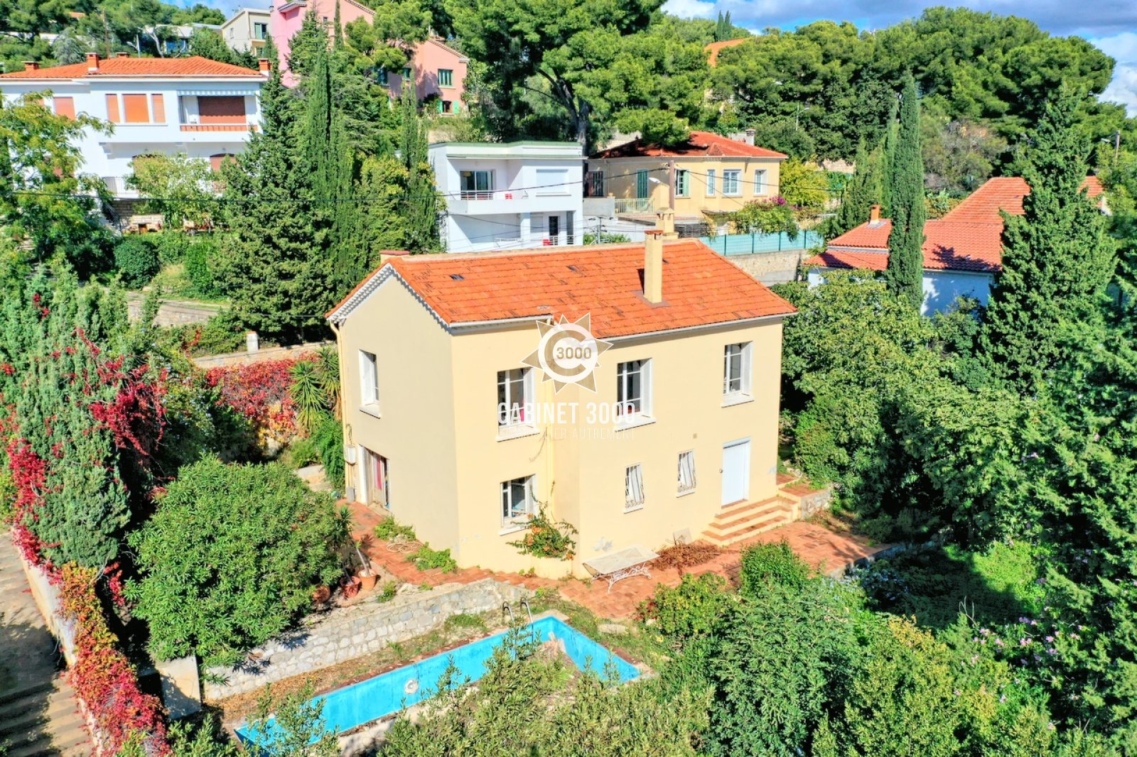 A RENOVER - A Toulon, à proximité de La Valette, au calme, vue dégagée avec petite vue mer pour cette lumineuse maison familiale des années 50 de type T7 de 163 m², comprenant 2 appartements reliés par escalier intérieur. En rez-de-chaussée : cuisine, salon/séjour de 40 m² avec cheminée, 1 chambre, salle de bain, WC ; En rez-de-jardin : cuisine ouverte, séjour, 2 chambres (transformables en 4 chambres), salle de bain avec WC. Atelier de 33 m² avec point d'eau et entrée indépendante, grenier avec dalle de béton, buanderie et terrasses sur une parcelle de 650 m² avec piscine et garage de 16 m².