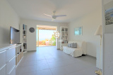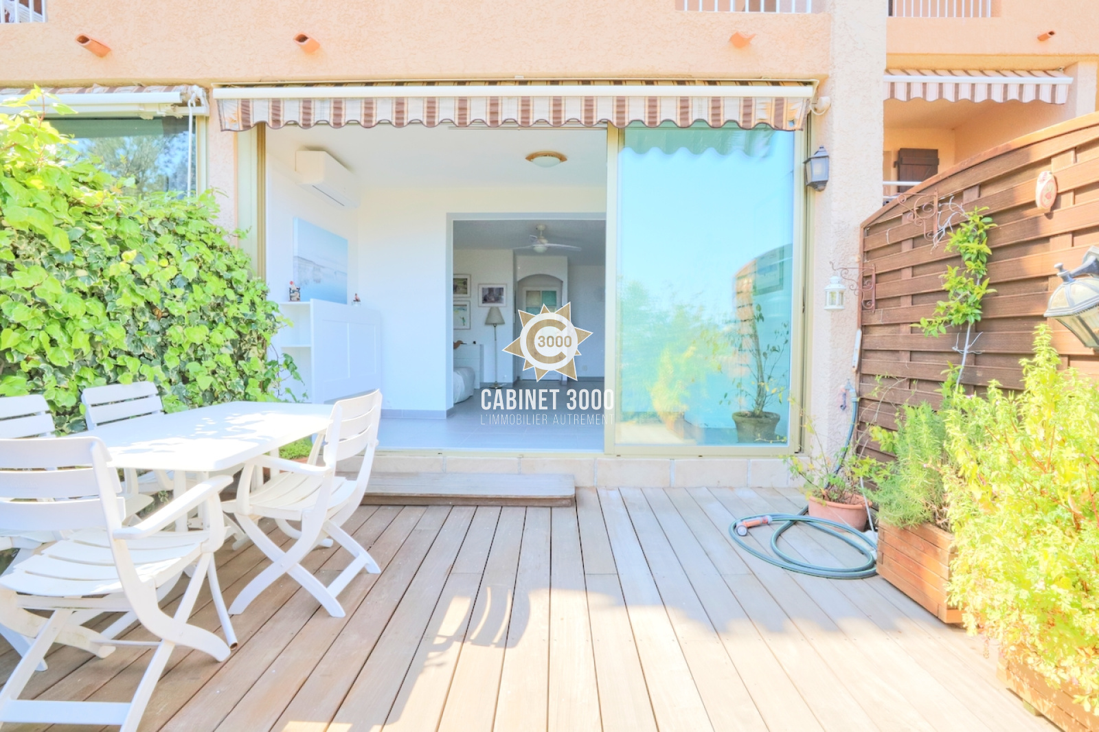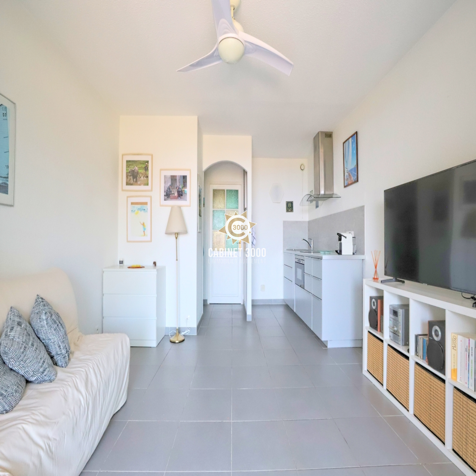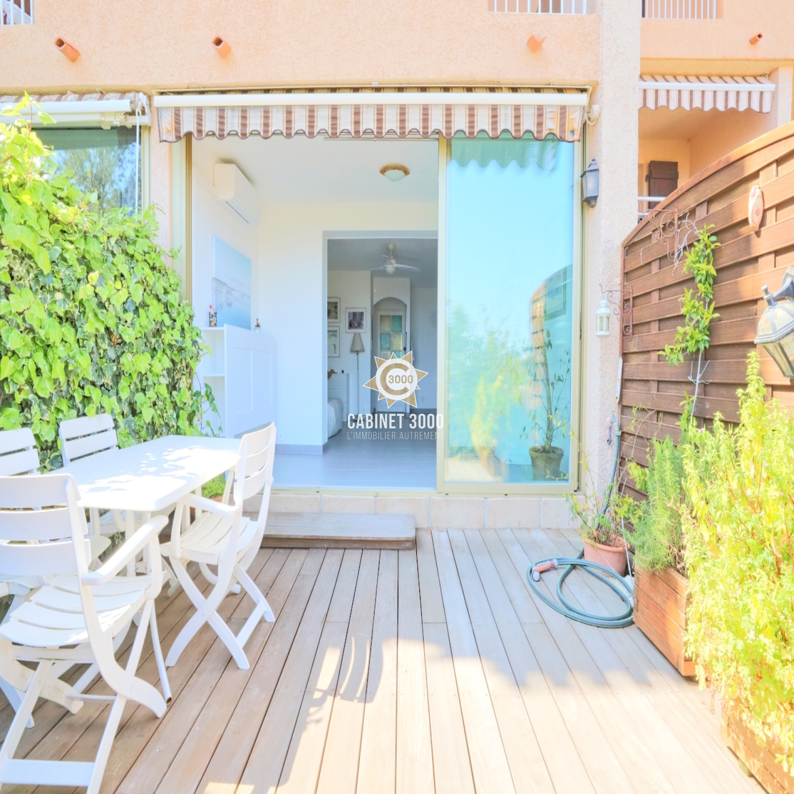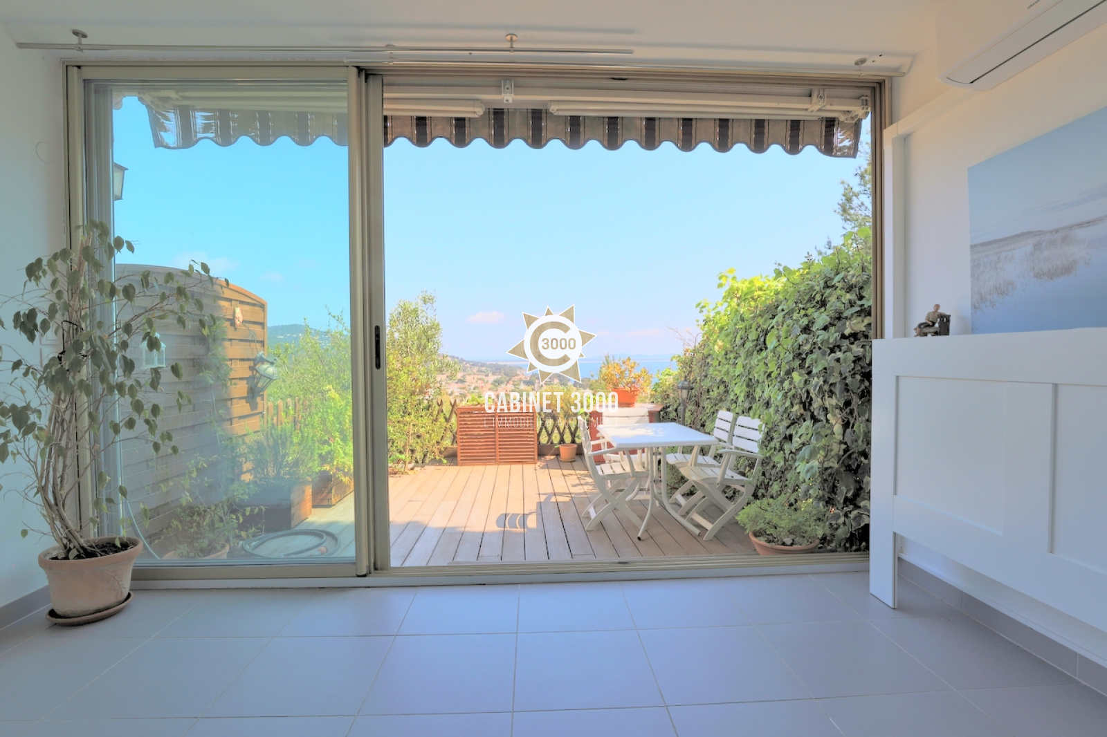 A Carqueiranne, Les Hauts des Terrasses de la Mer, au rez-de-chaussée, vue mer pour ce lumineux appartement de type T1 de 33 m², en parfait état, comprenant : cuisine/salon/séjour donnant sur véranda et terrasse de 15 m², salle d'eau avec WC, cave et place de parking privative dans copropriété au calme.