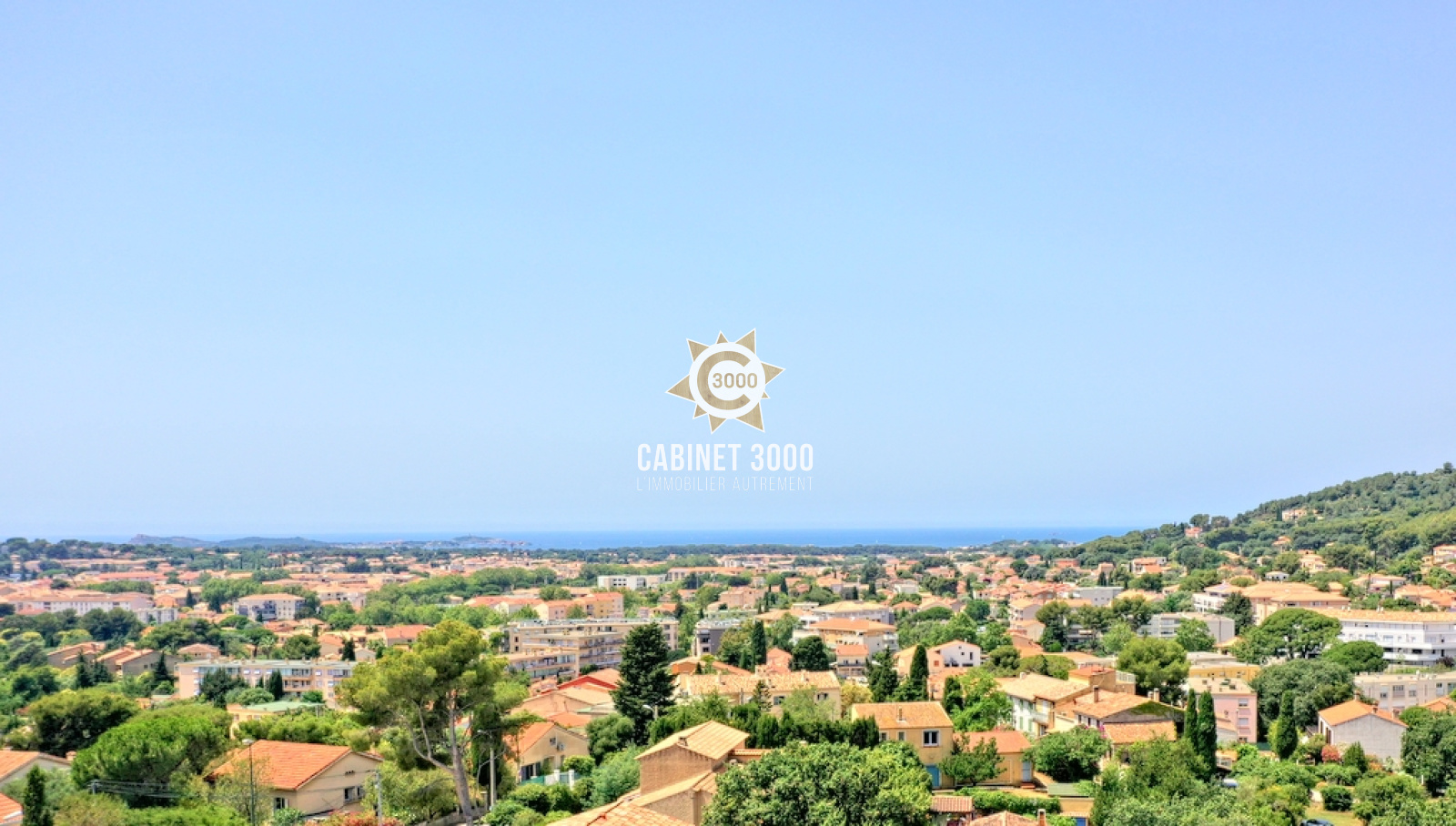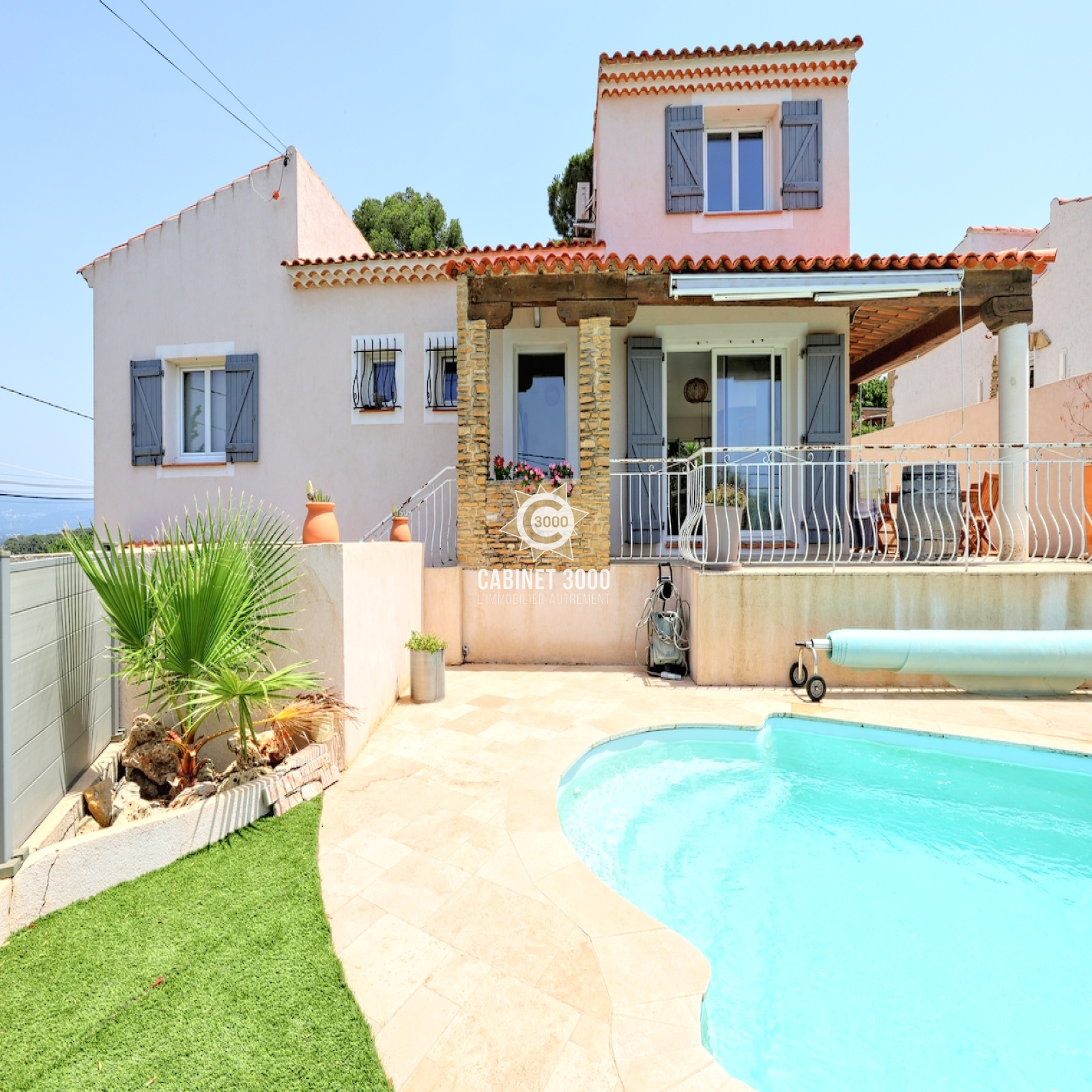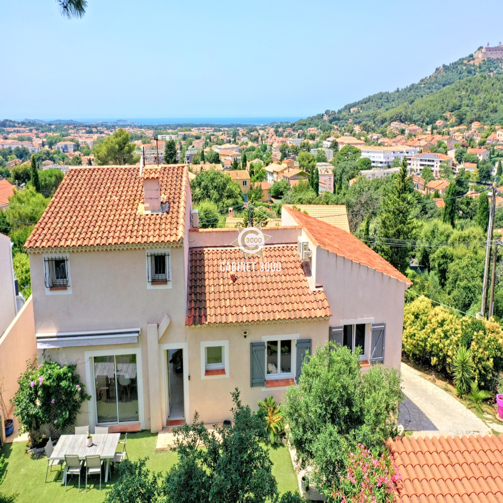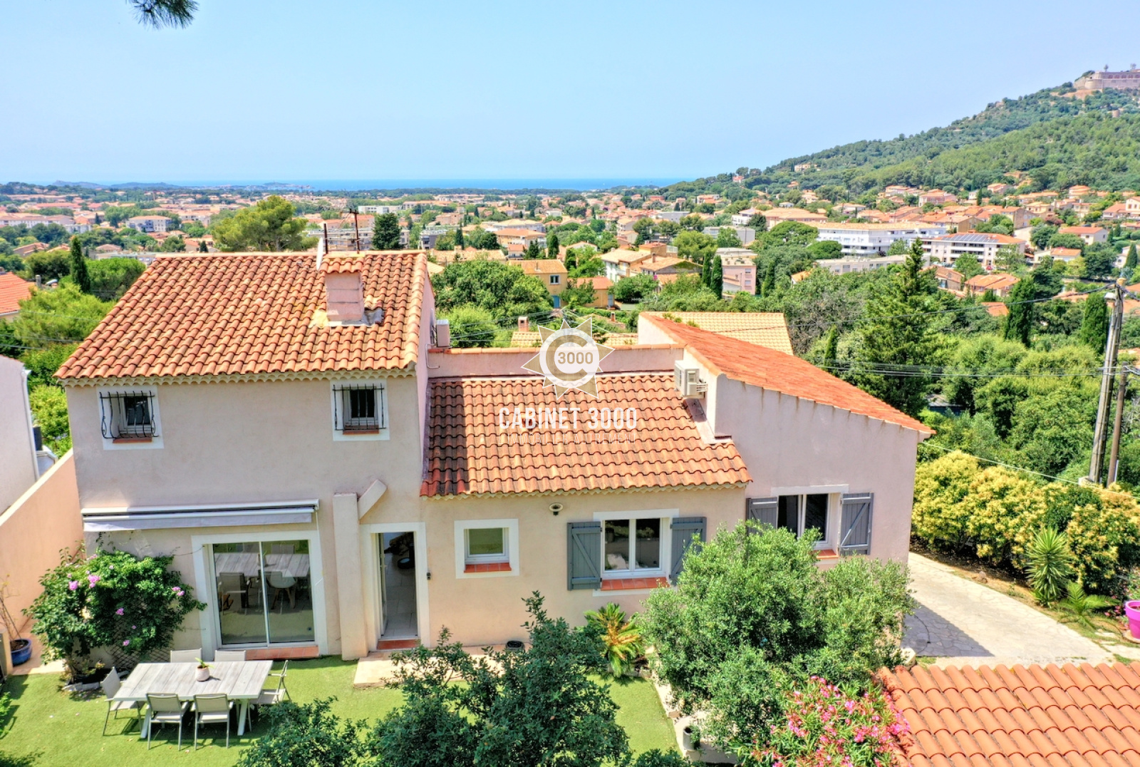 EXCLUSIVITE - A Six Fours Les Plages, quartier Pourqueiron, au calme, vue mer et sur le Fort pour cette lumineuse maison de type T4 de 121 m², traversante Est-Ouest, comprenant : cuisine ouverte et salon/ séjour de 47m², 3 chambres dont 2 de plain-pied et une suite parentale à l'étage, bureau, 2 salles d'eau, 2 WC et garage, sur une parcelle de 780 m² avec pisicne, à proximité du Centre Ville.