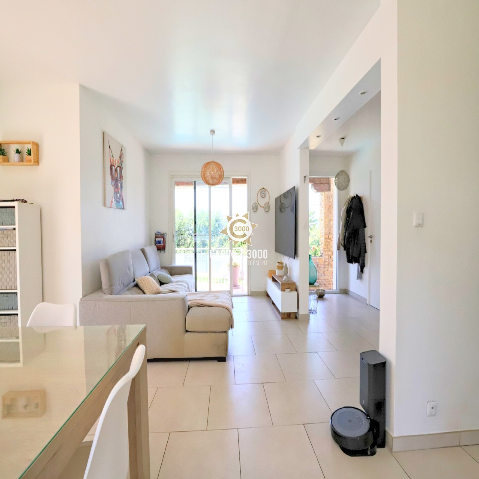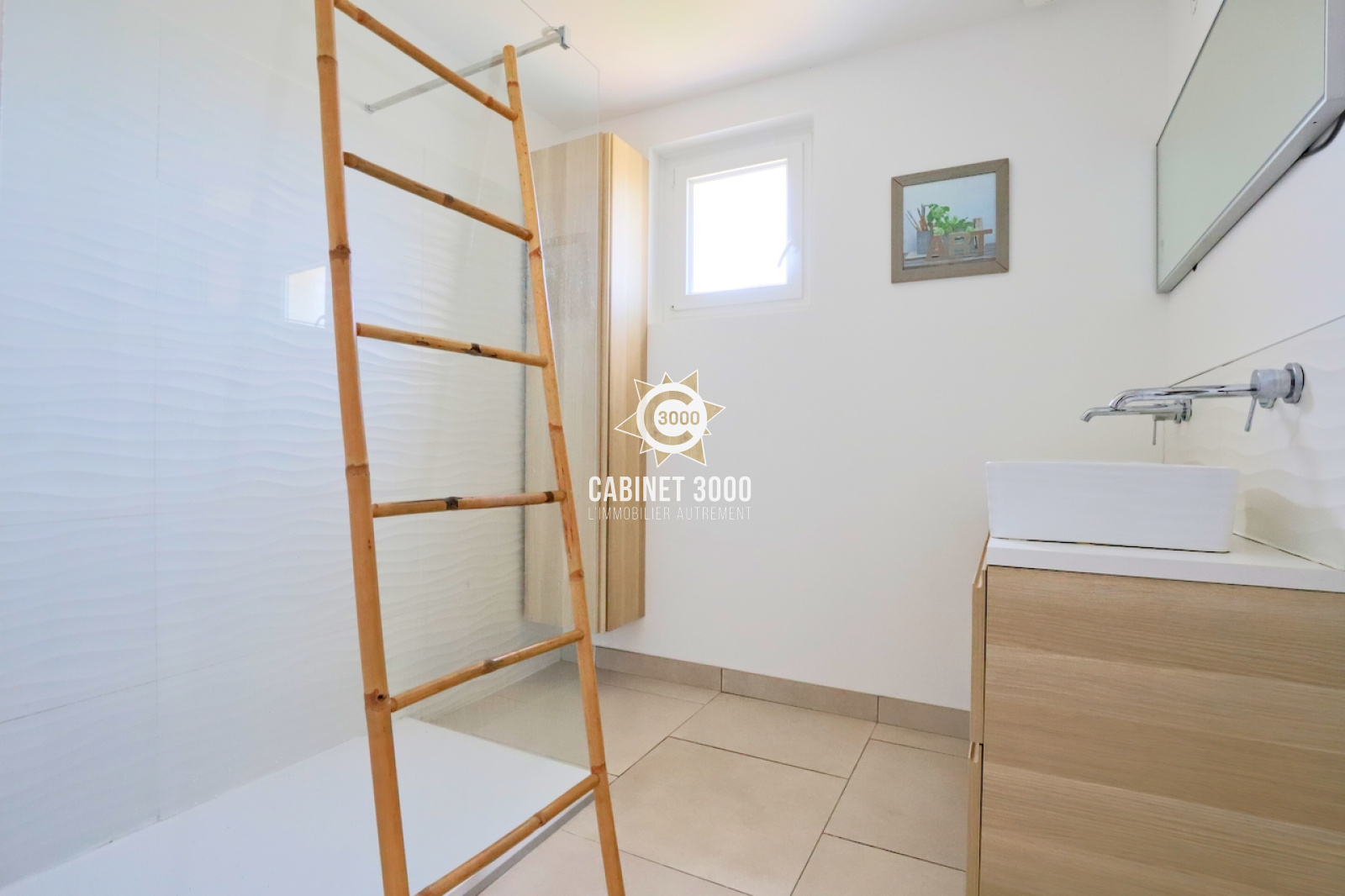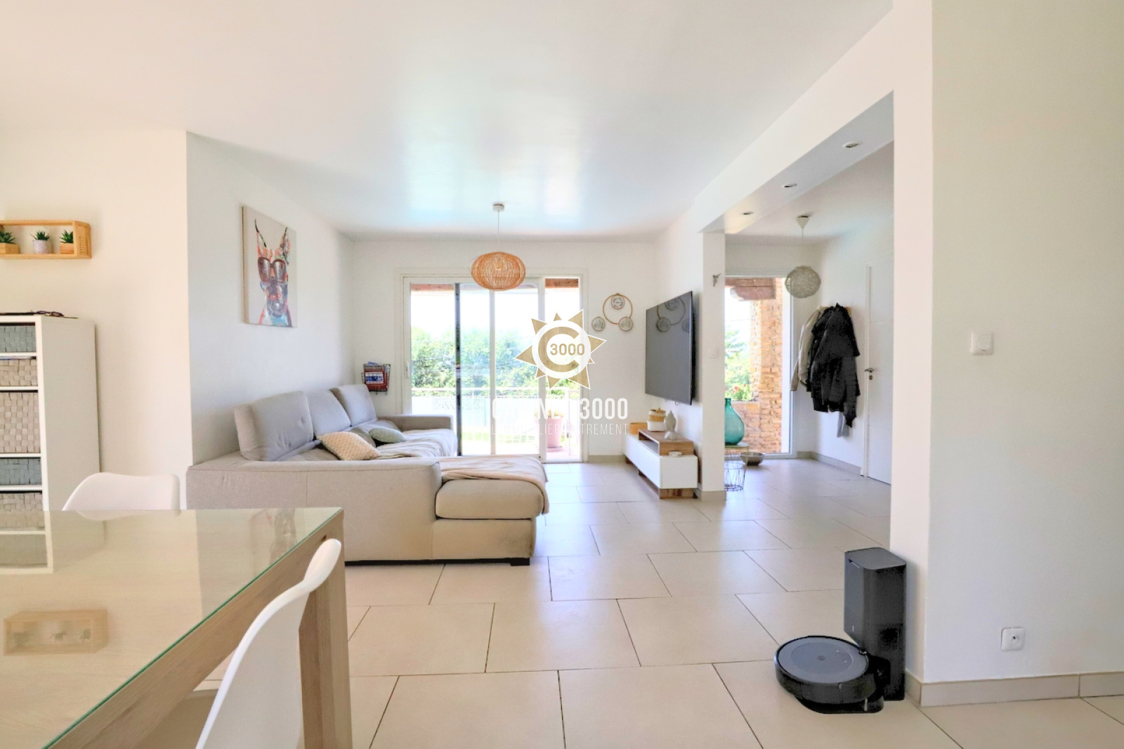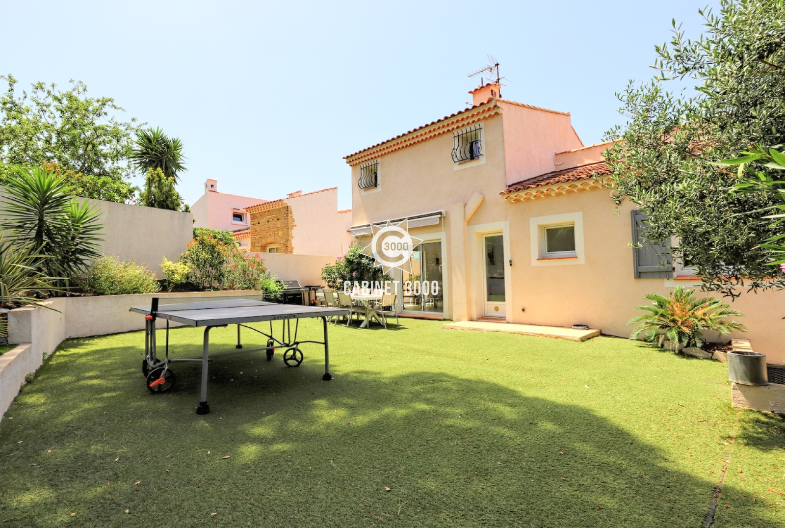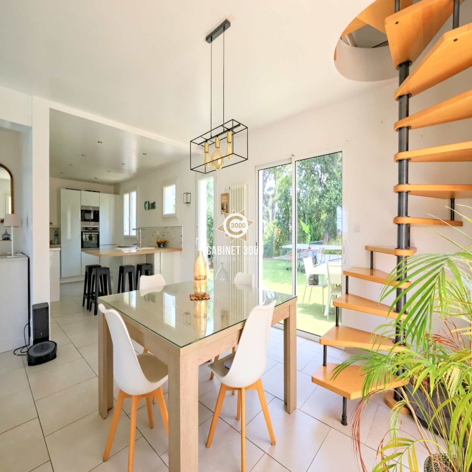 EXCLUSIVITE - A Six Fours Les Plages, quartier Pourqueiron, au calme, vue mer et sur le Fort pour cette lumineuse maison de type T4 de 121 m², traversante Est-Ouest, comprenant : cuisine ouverte et salon/ séjour de 47m², 3 chambres dont 2 de plain-pied et une suite parentale à l'étage, bureau, 2 salles d'eau, 2 WC et garage, sur une parcelle de 780 m² avec pisicne, à proximité du Centre Ville.