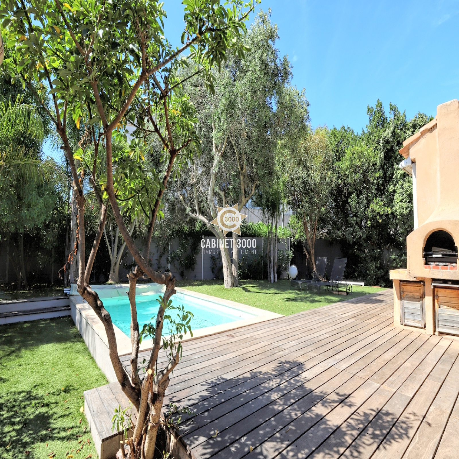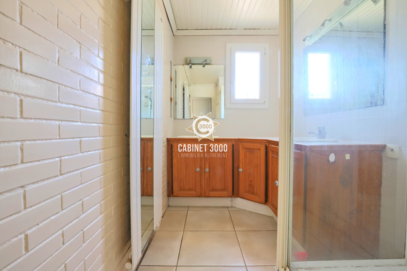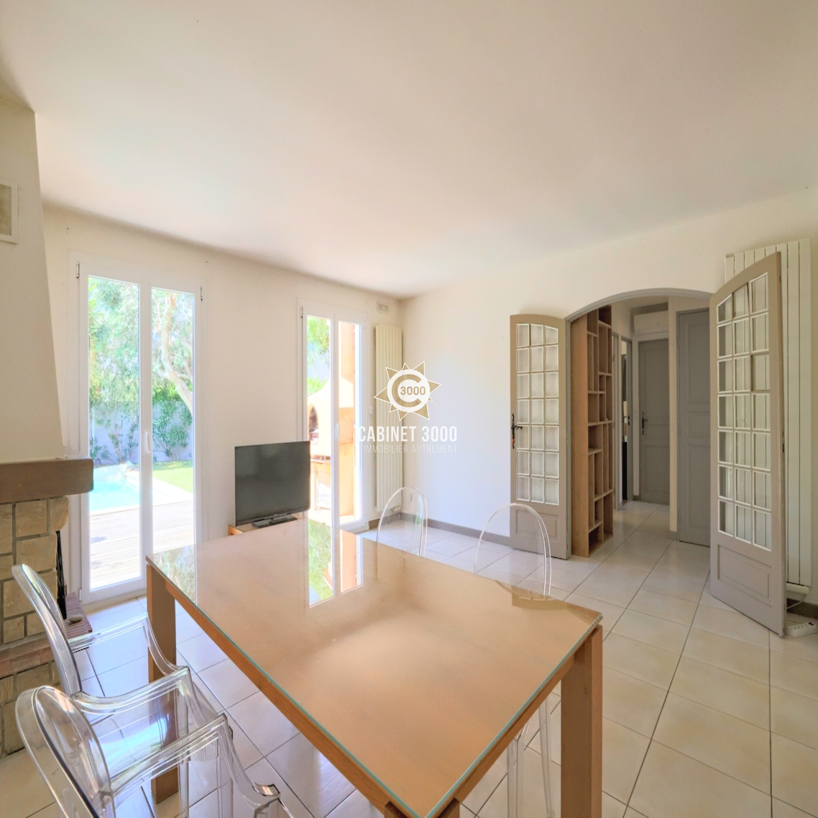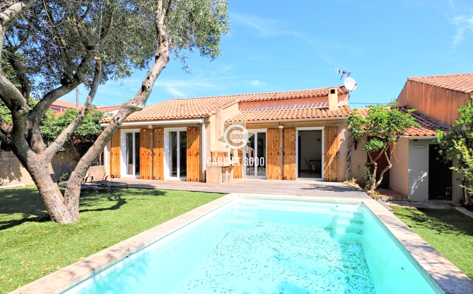 A La Seyne sur Mer, Les Sablettes, au fond d'une impasse au calme, lumineuse maison de plain-pied de type T4 de 90 m², comprenant : cuisine semi-ouverte, salon/séjour avec cheminée donnant sur terrasse et jardin, 3 chambres, salle d'eau, WC et dressing, sur une parcelle de 460 m² avec garage de 20 m² et piscine, à deux pas des plages et des commerces.