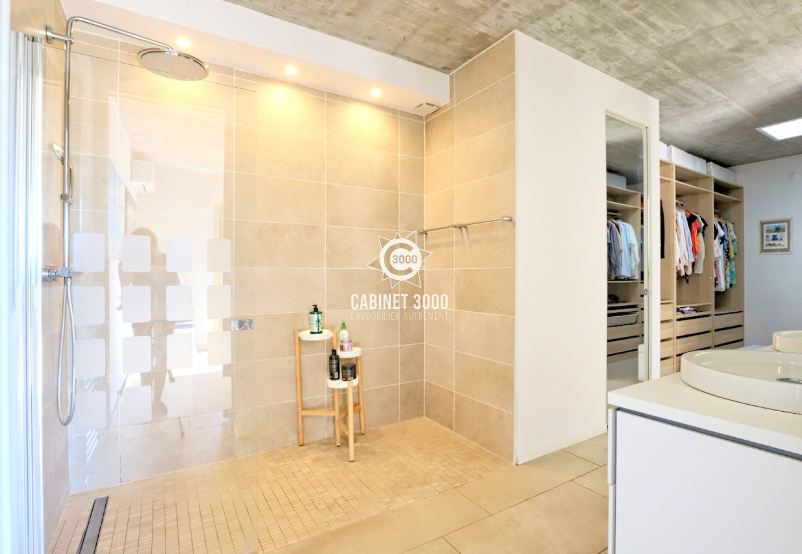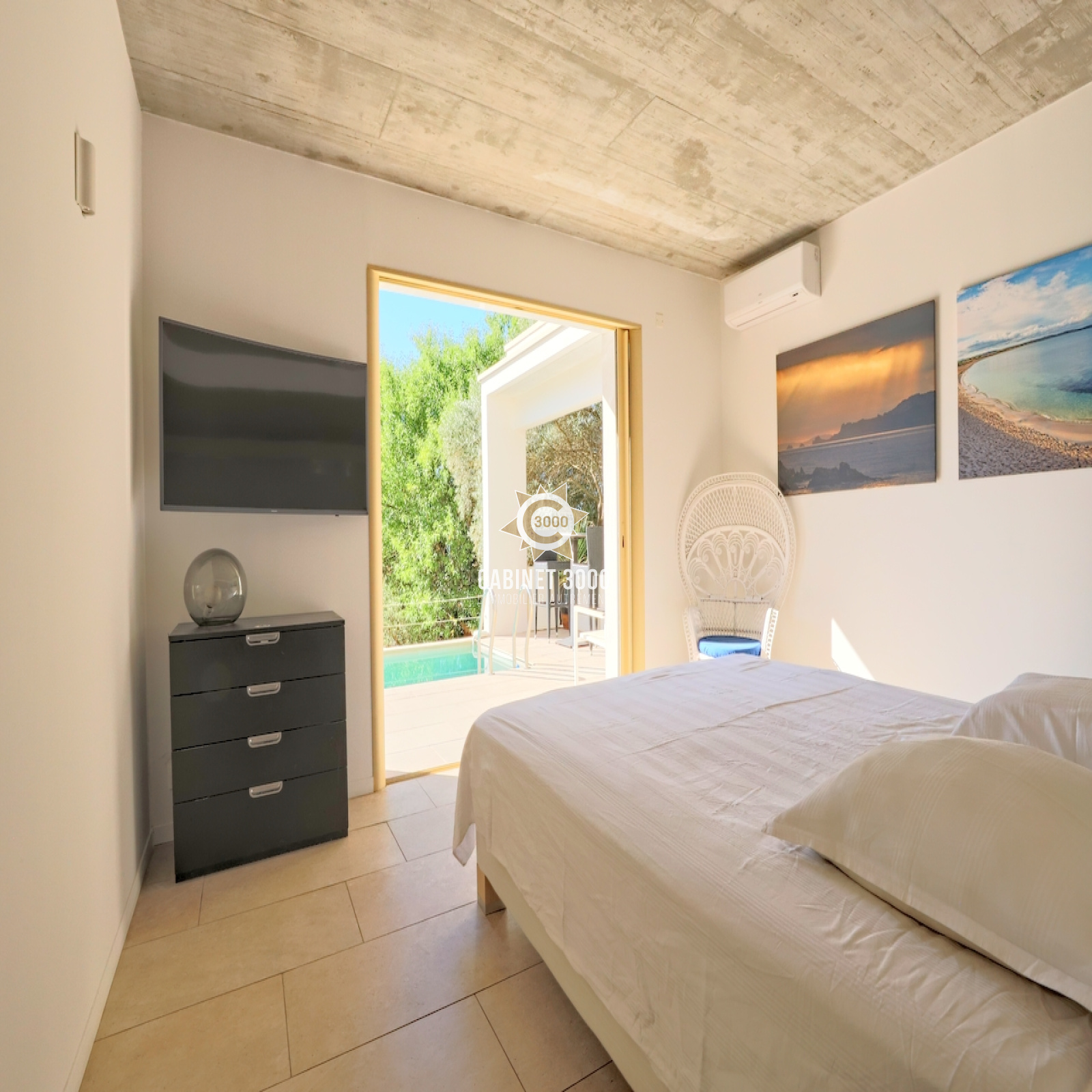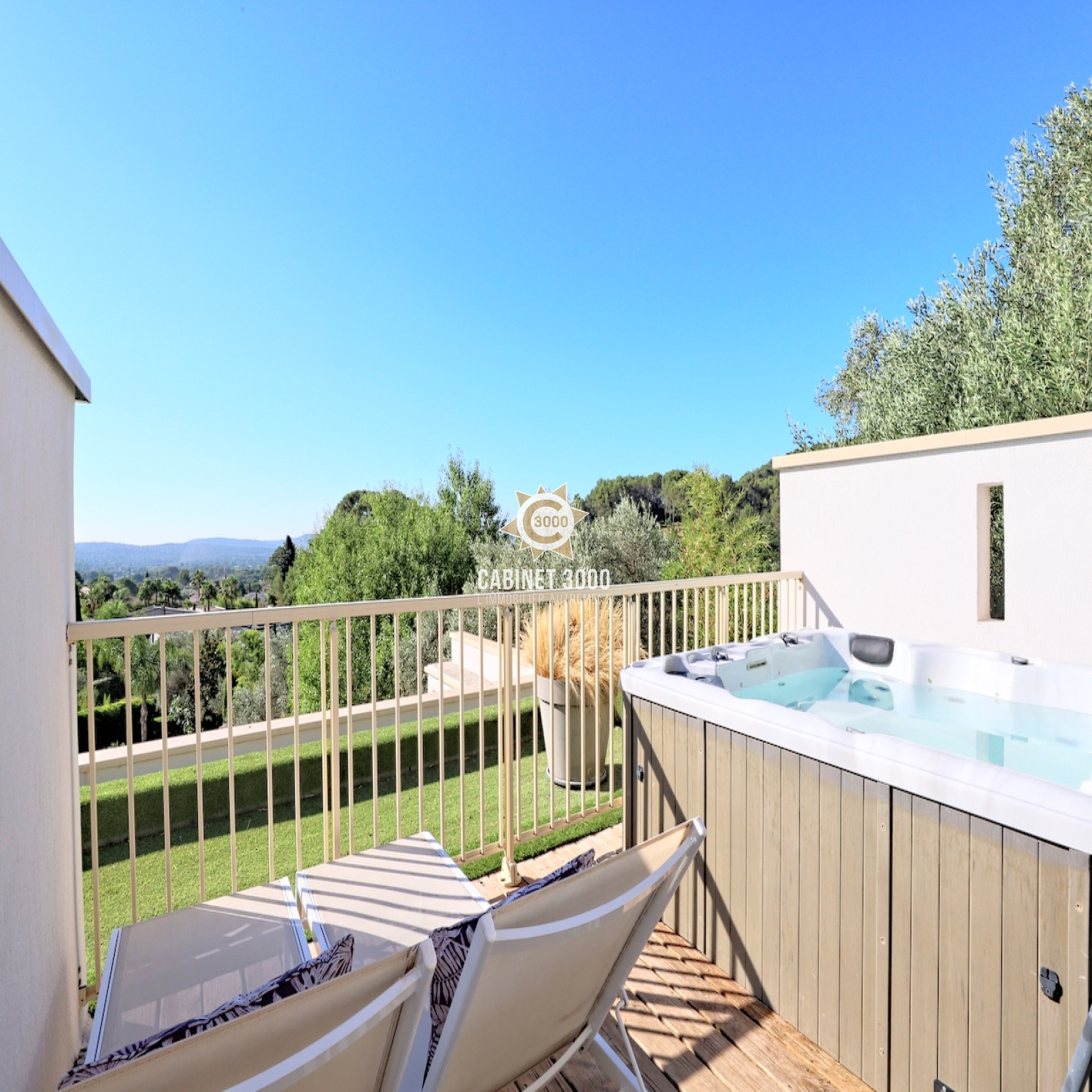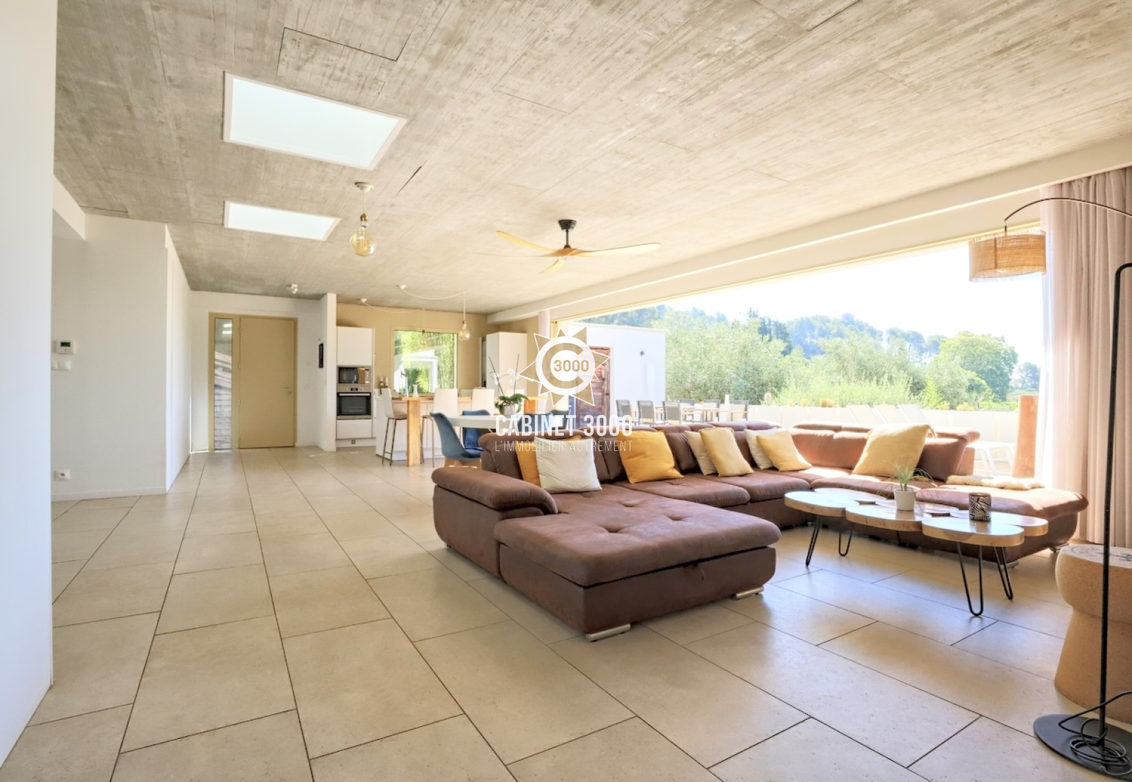 RARE A LA VENTE - A Sollies-Pont, Sainte Christine, dans un écrin de verdure au calme, lumineuse maison contemporaine de 239 m² aux prestations et équipements haut de gamme, comprenant : au rez-de-chaussée, cuisine ouverte avec cave à vin, séjour de 77 m² donnant sur terrasse de 75 m² avec piscine, 2 chambres dont une suite parentale avec salle d'eau, WC et dressing, buanderie ; à l'étage entrées indépendantes pour les 2 studios avec terrasse dont une avec jacuzzi et l'appartement de type T2 avec terrasse, sur une parcelle en restanques de 6024 m² avec garage double et parkings pour plusieurs véhicules, à proximité des commodités. Bonne rentabilité locative saisonnière ou annuelle pour les 3 appartements indépendants