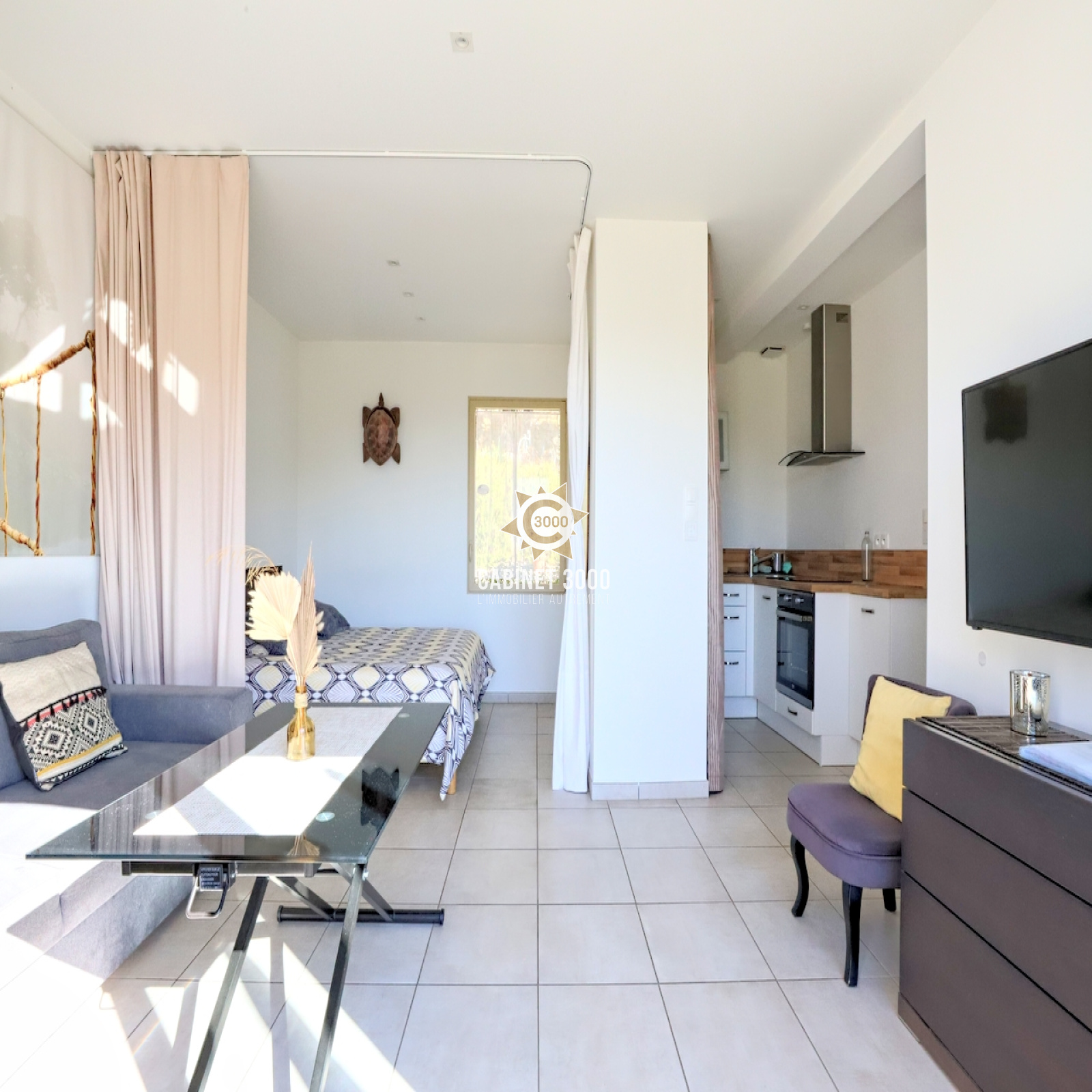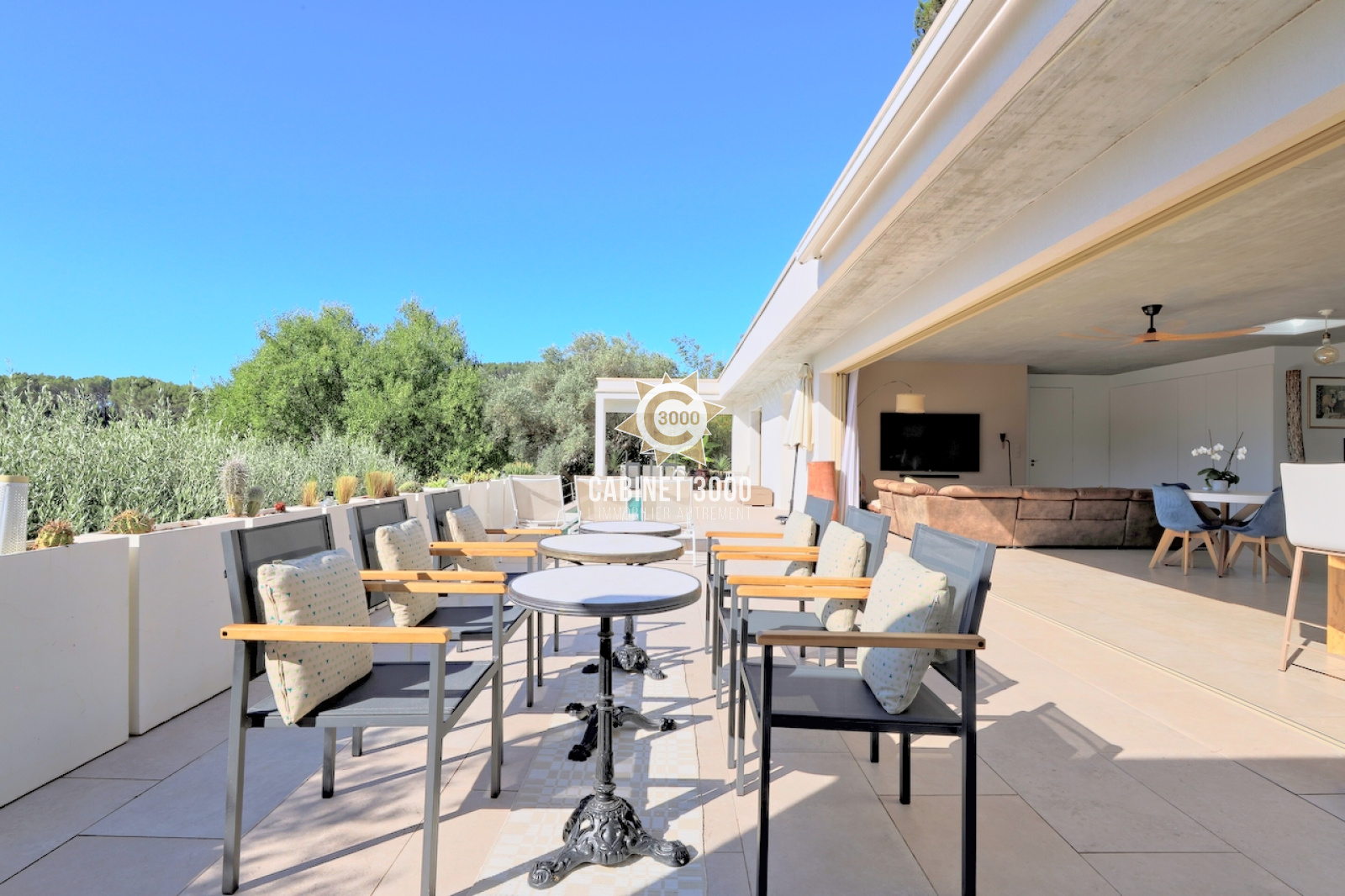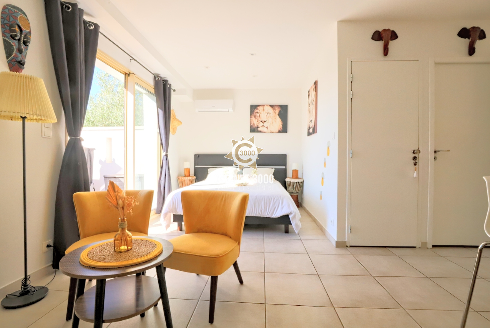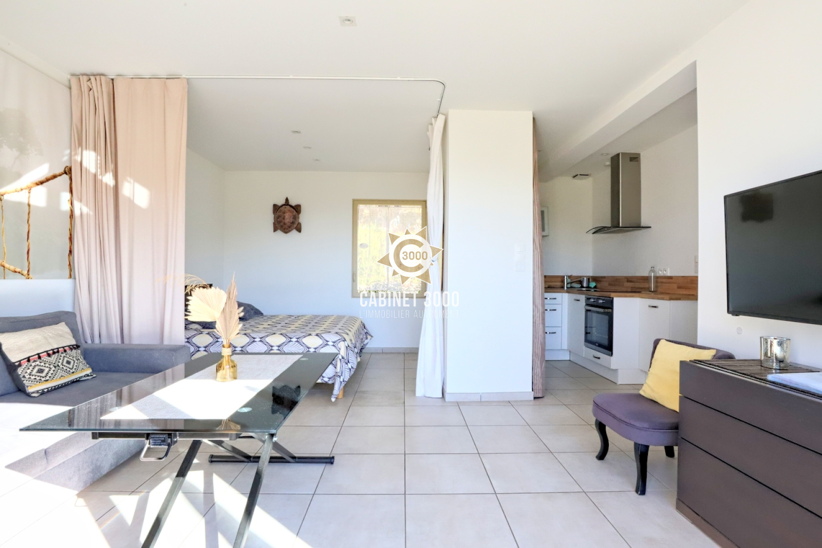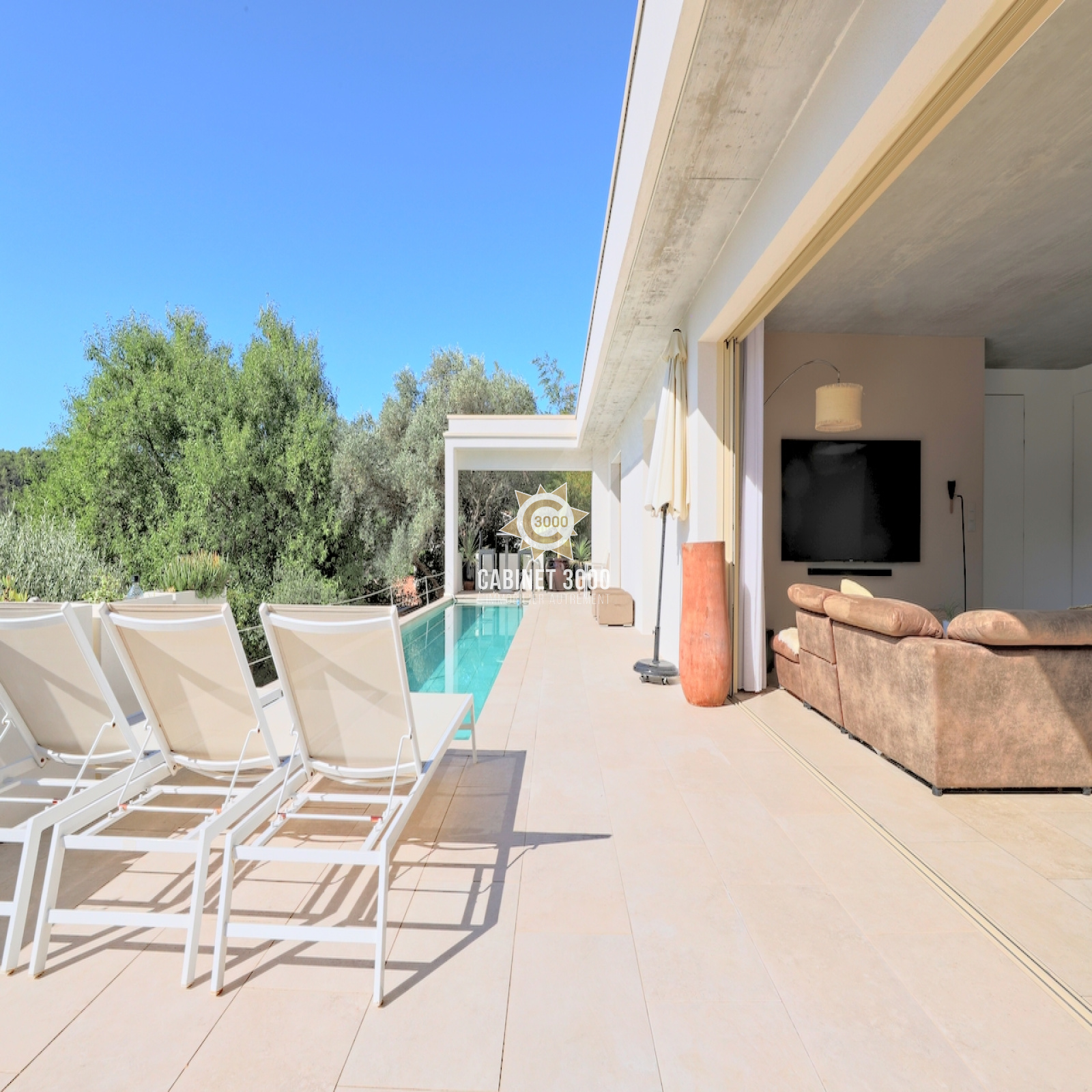RARE A LA VENTE - A Sollies-Pont, Sainte Christine, dans un écrin de verdure au calme, lumineuse maison contemporaine de 239 m² aux prestations et équipements haut de gamme, comprenant : au rez-de-chaussée, cuisine ouverte avec cave à vin, séjour de 77 m² donnant sur terrasse de 75 m² avec piscine, 2 chambres dont une suite parentale avec salle d'eau, WC et dressing, buanderie ; à l'étage entrées indépendantes pour les 2 studios avec terrasse dont une avec jacuzzi et l'appartement de type T2 avec terrasse, sur une parcelle en restanques de 6024 m² avec garage double et parkings pour plusieurs véhicules, à proximité des commodités. Bonne rentabilité locative saisonnière ou annuelle pour les 3 appartements indépendants