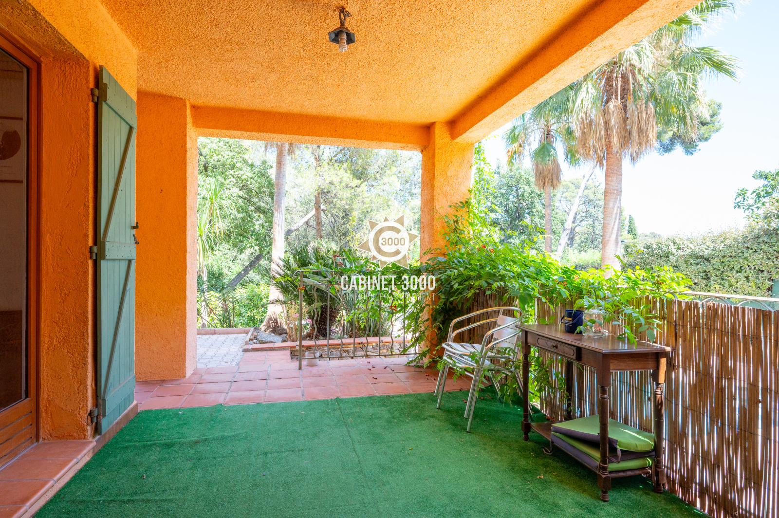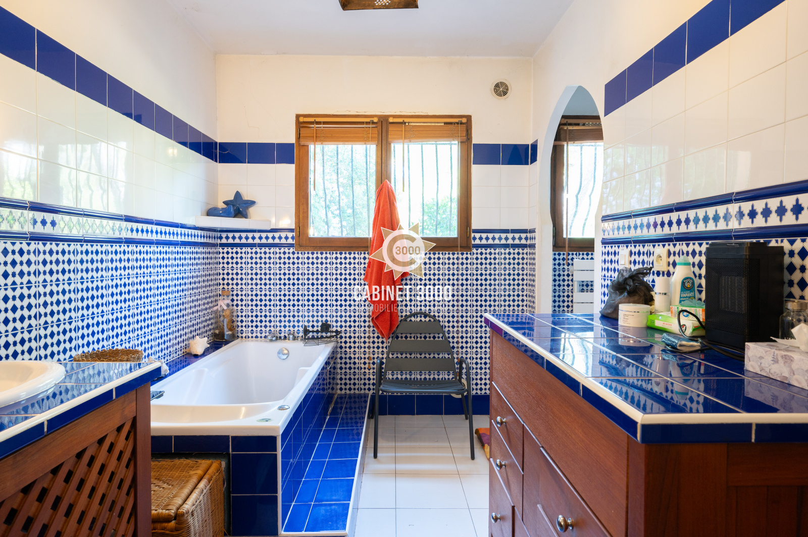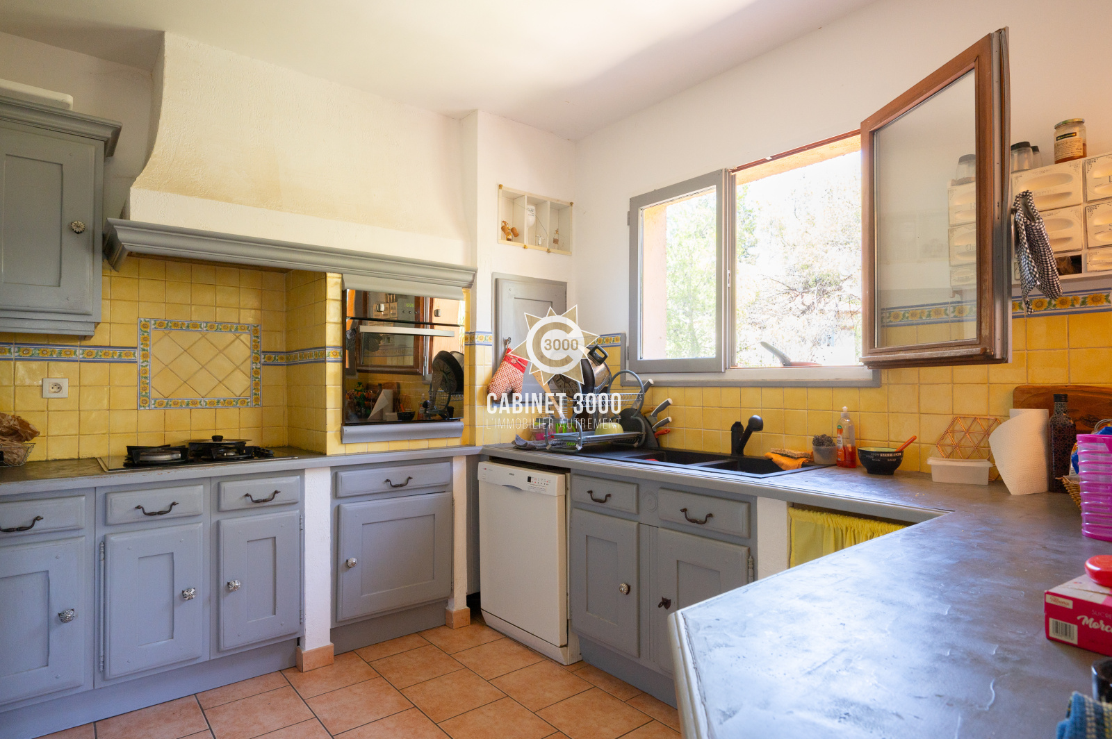 A Hyères, Costebelle, dans un écrin de verdure, beaux volumes pour cette lumineuse maison familiale de type T8 de 231 m², vue mer, avec de belles prestations, actuellement divisée en 4 appartements, mais facilement réunifiable : au 1er étage un appartement de type T4 de 124 m², comprenant : cuisine, séjour de 44 m² donnant sur grande terrasse, 2 chambres avec placards, salle de bain, WC et buanderie ; au rez-de-chaussée : 1 appartement de type T1 et 2 appartements de type T2 sur une parcelle de 800 m² avec piscine, forage et parkings, à 5 mn de la plage de l'Almanarre.