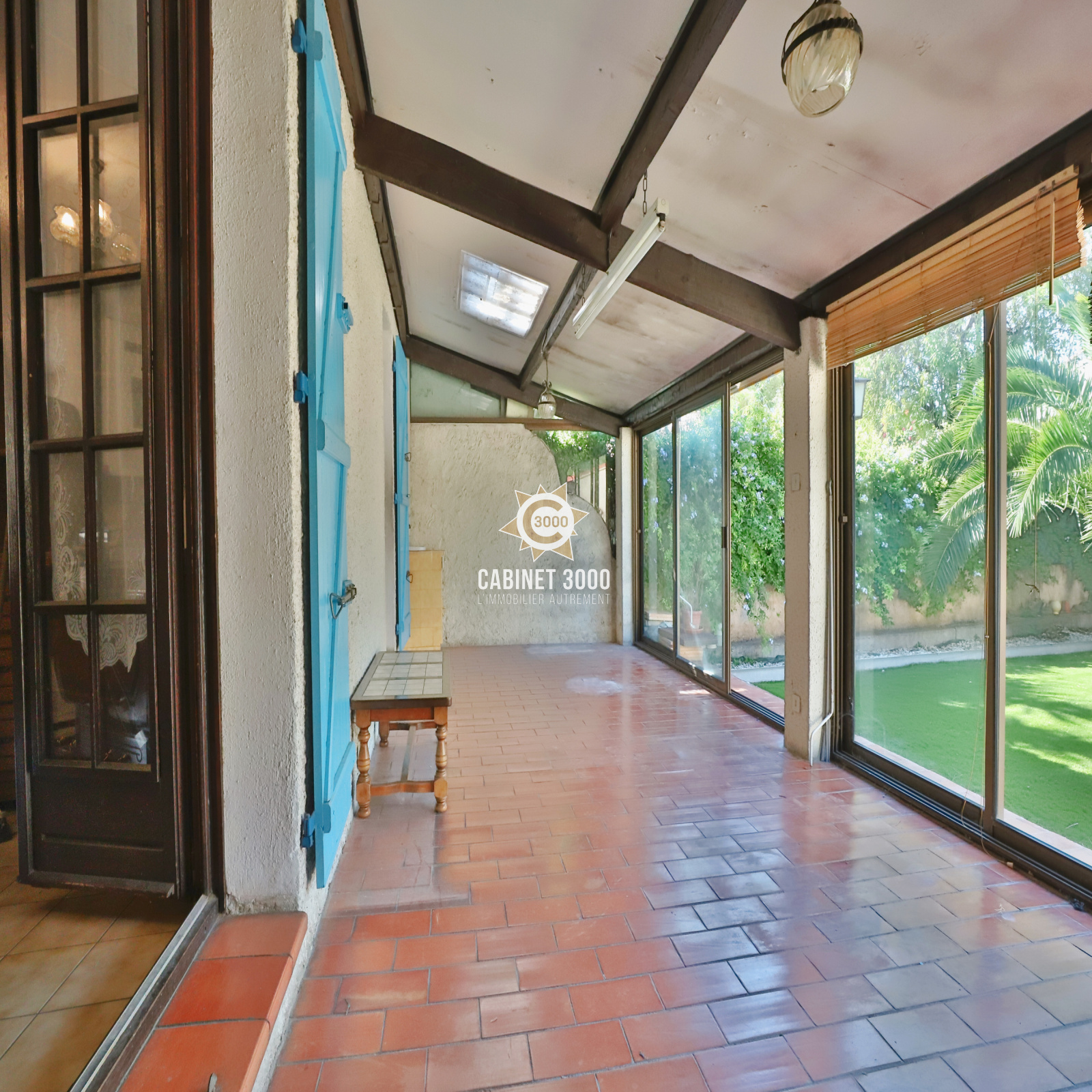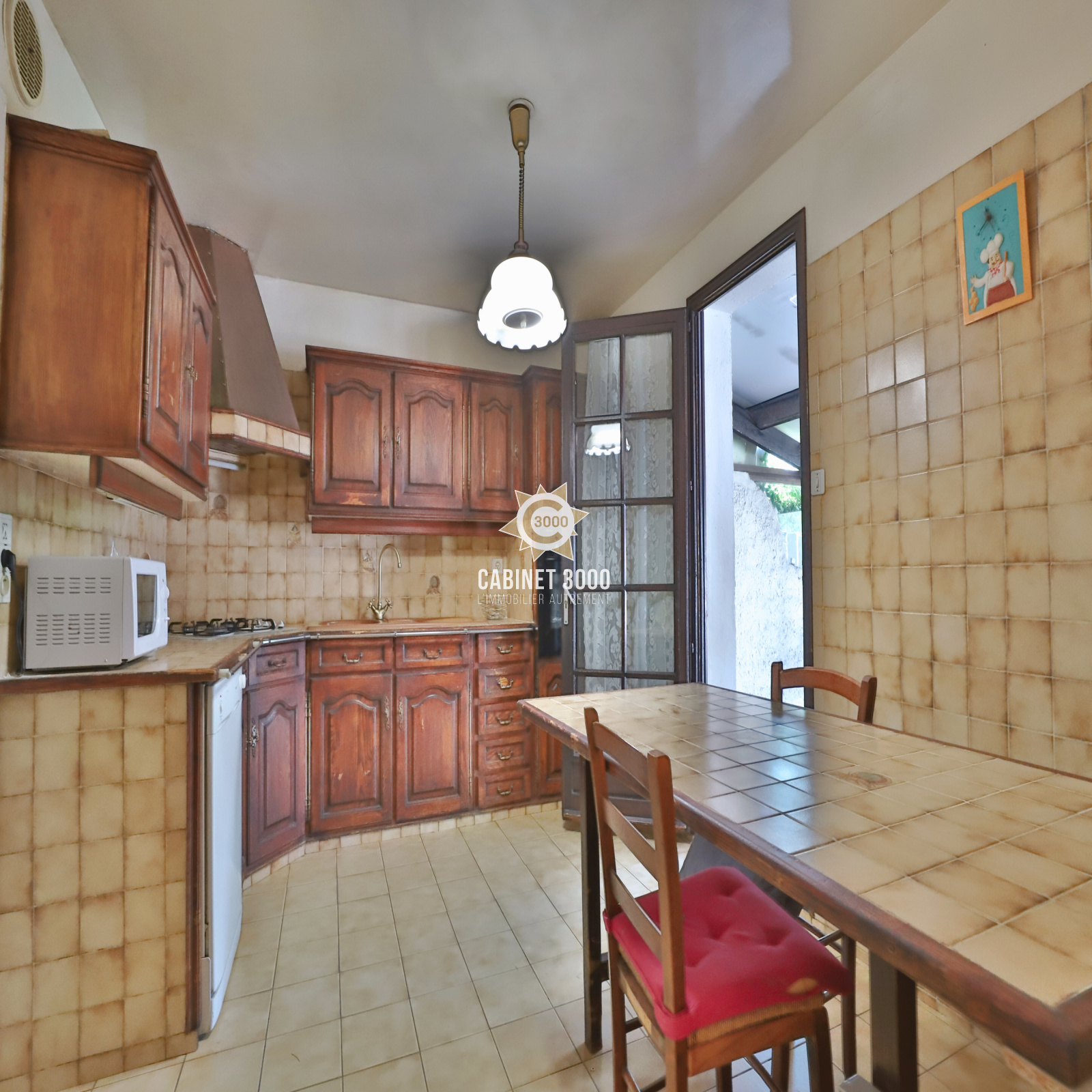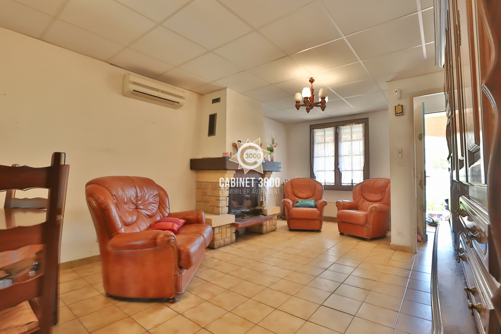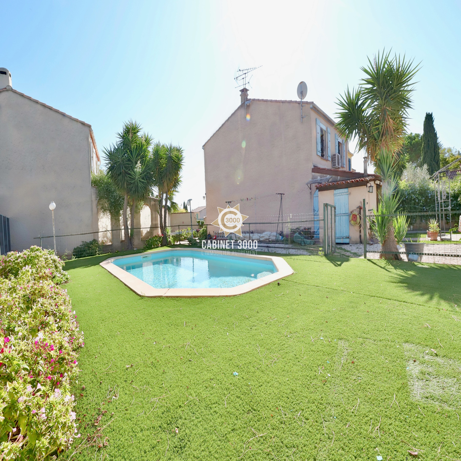 EXCLUSIVITE - A La Farlède, Centre-Ville, au calme absolu, maison mitoyenne d'un côté de type T5 de 118 m² comprenant : cuisine, salon/séjour avec cheminée à insert donnant sur véranda de 26 m² et jardin, 4 chambres avec placards, salle de bain, salle d'eau, WC et cellier, sur une parcelle de 525 m² avec piscine et dépendance. A rafraichir.